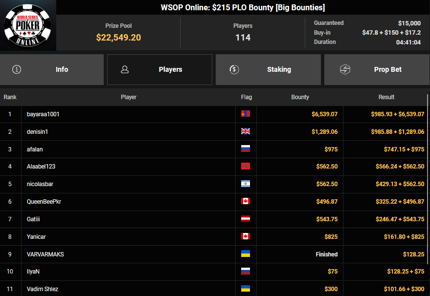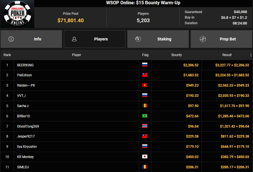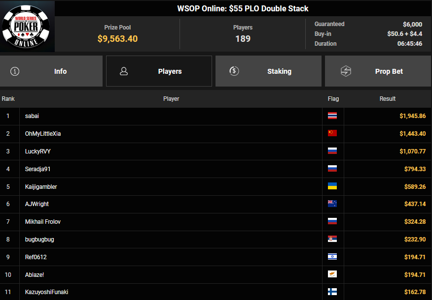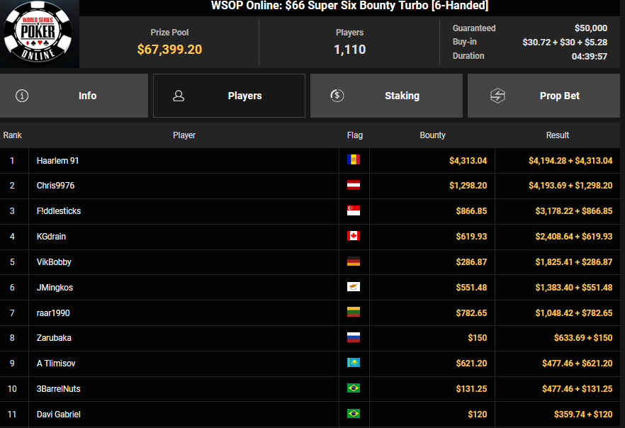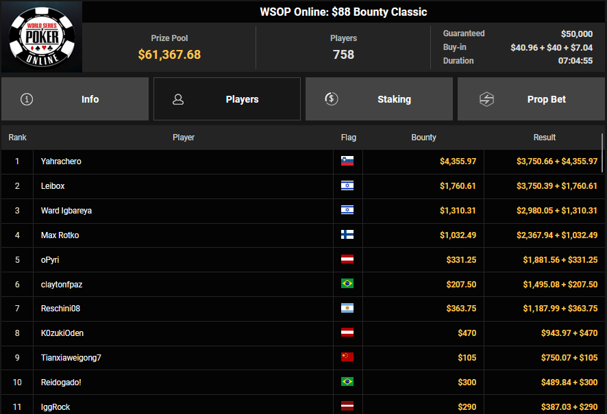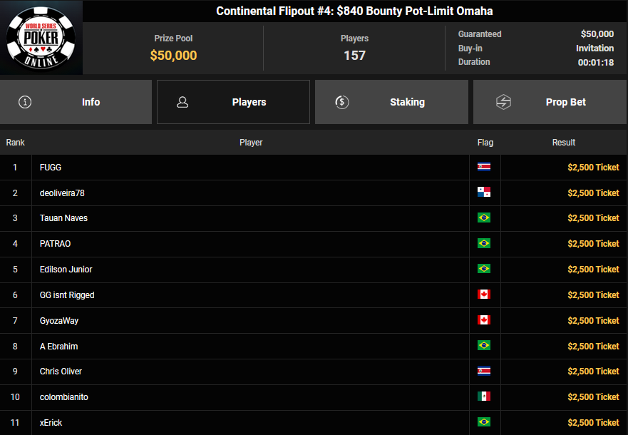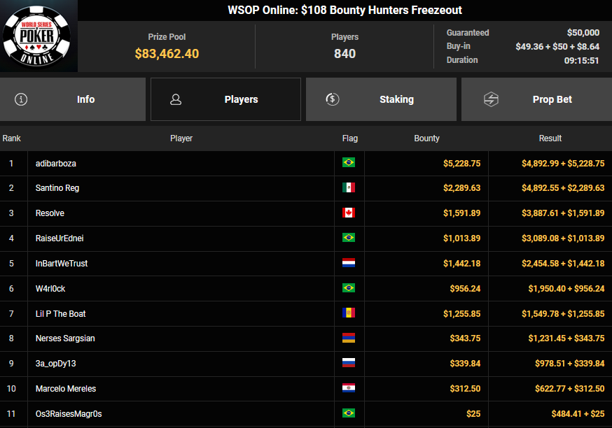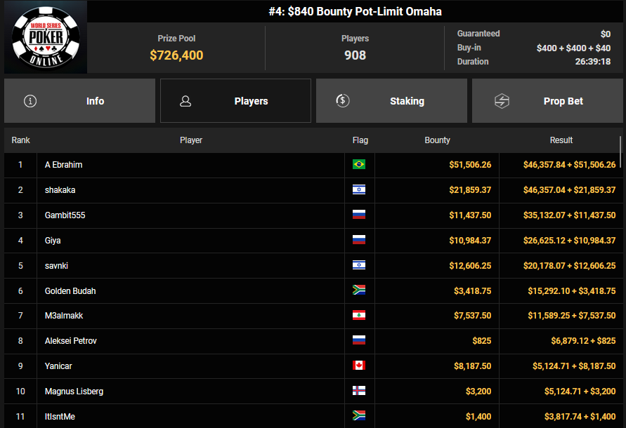 Schon vor dem Finale beim $840 Bounty PLO (#4) war klar, dass es einen deutschsprachigen Erfolg geben würde. Von den 908 Entries waren noch zehn Spieler übrig, die Israelis hatten eine Doppelführung. Am Ende aber ging der Sieg doch wieder nach Brasilien, A Ebrahim jubelte über $43.357 + $51.506 und den $30.000 WSOPP Super Pass.