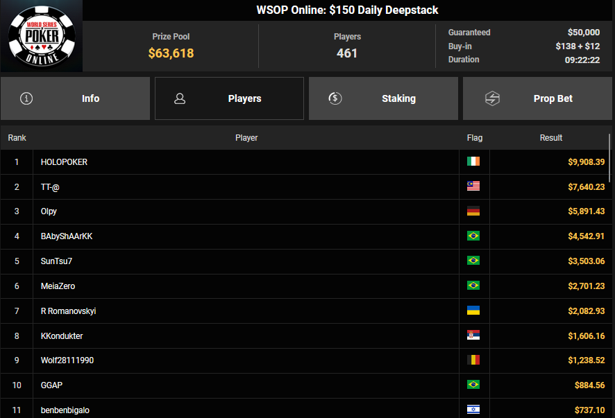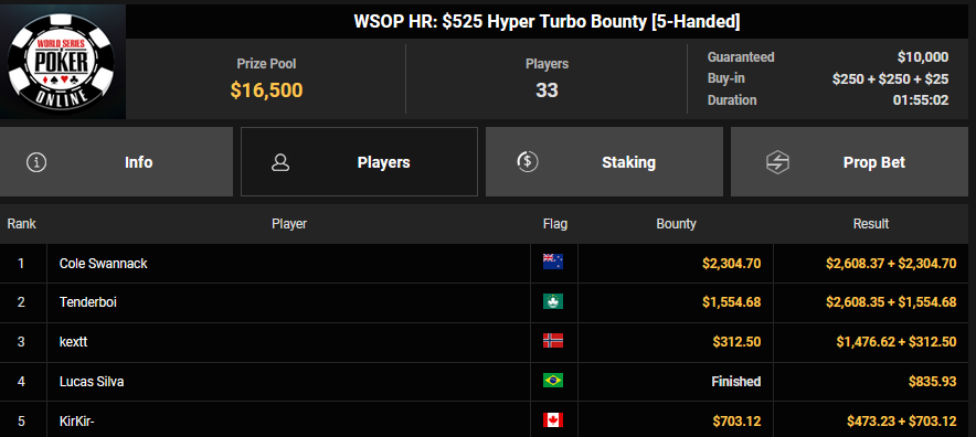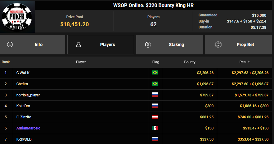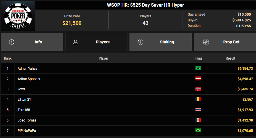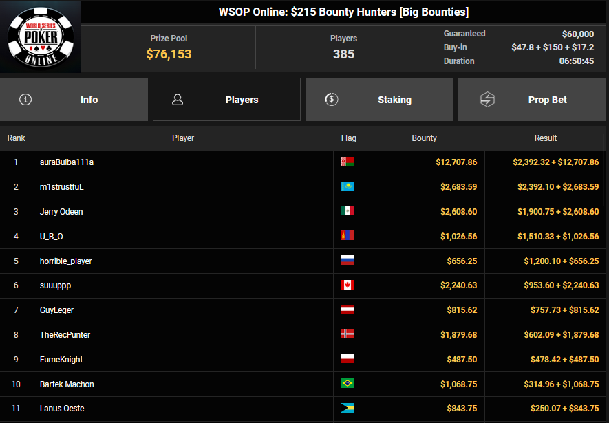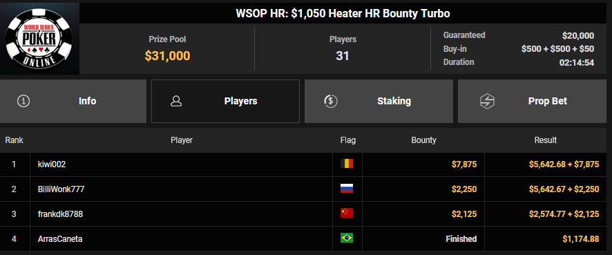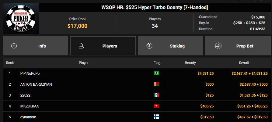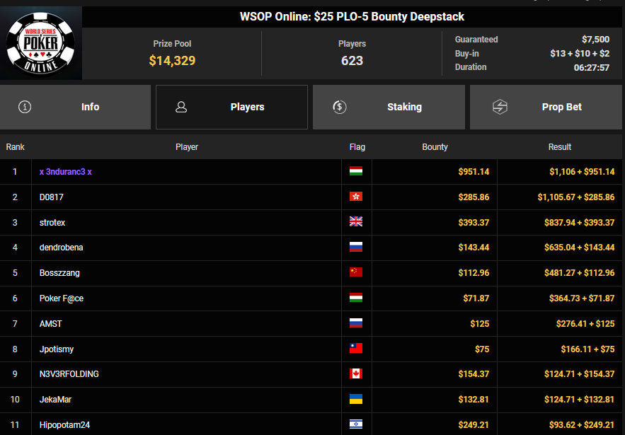 Karluz wurde beim $525 Bounty Hunters HR Runner-up für $13.678 + $3.300, auch HardiZ1 wurde Runner-up beim $250 Daily Main Event und konnte sich über $5.244 freuen. Olpy belegte beim $150 Daily Deepstack Rang 3 für $5.891, Lik3aZ0mbY konnte den Sieg beim $4 Fifty Stack für $5.551 holen.