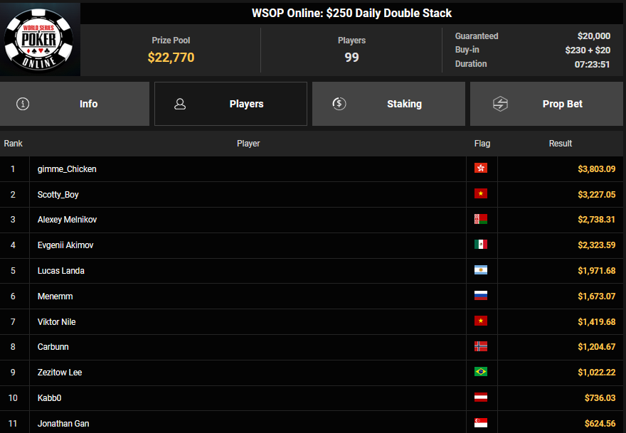 Weiterhin laufen die Flights beim $215 Mystery Millions ($10.000.000 GTD). Nutzt auf jeden Fall die Satellites, um euch bankroll-schonend zu den Turniertickets zu spielen. Turniere & Satellites sind im Client im „WSOP“ Tab zu finden, alle Infos zu den Events gibt es auch auf den Seiten von GGPoker.