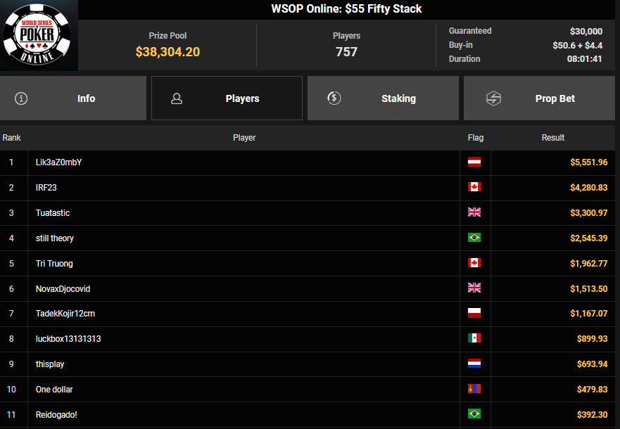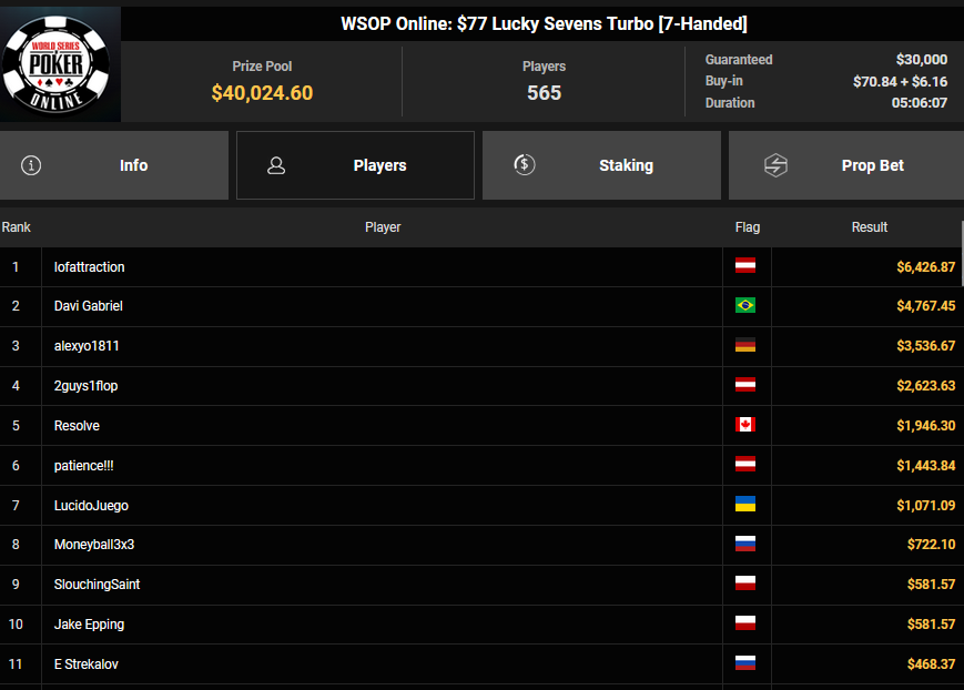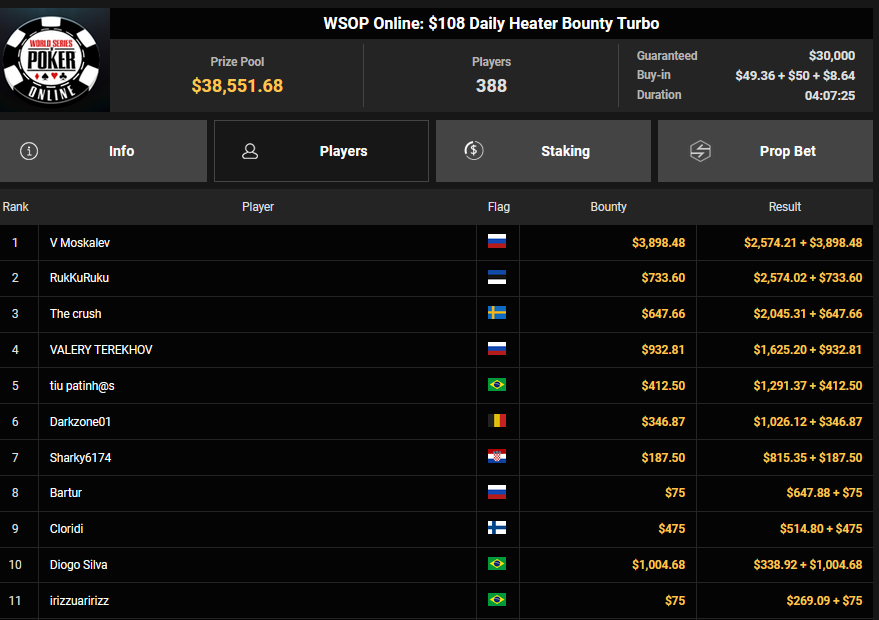 El Zinzito siegte beim $525 Fifty Stack HR für $6.860, lofattraction wurde zunächst Dritter beim $32 Bounty King für $3.101 + $212, holte dann aber auch den Sieg beim $77 Lucky Sevens Turbo für $6.426. alexyo1811 belegte Rang 3 für $3.536, 2guys1flop wurde Vierter für $2.623. Chris9976 kassierte zu später Stunde noch $4.193 + $1.298 für Platz 2 beim $66 Super Six Bounty.