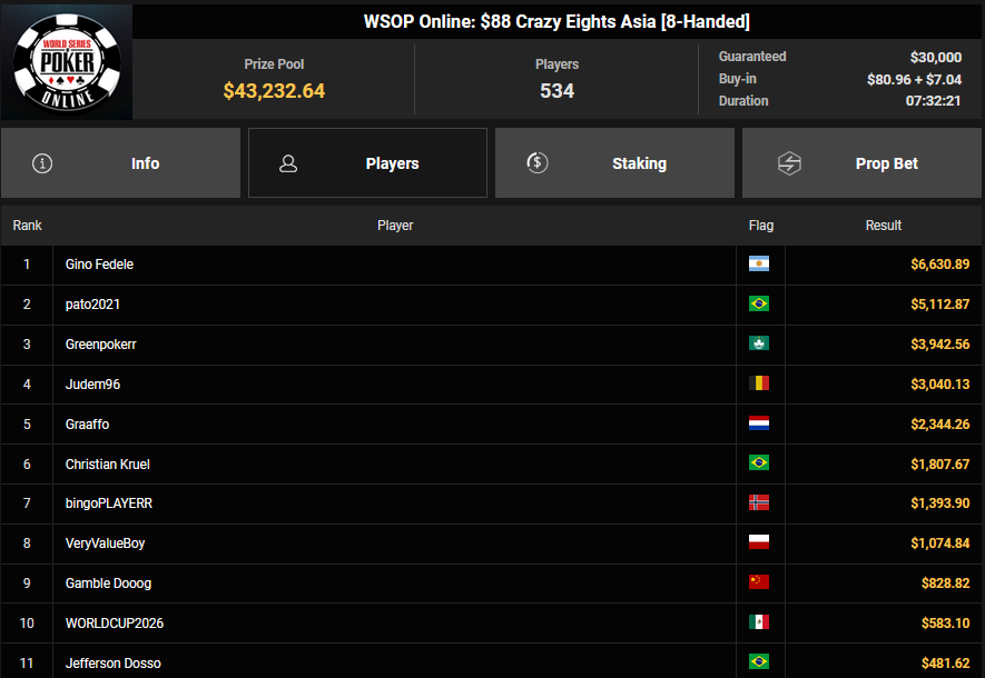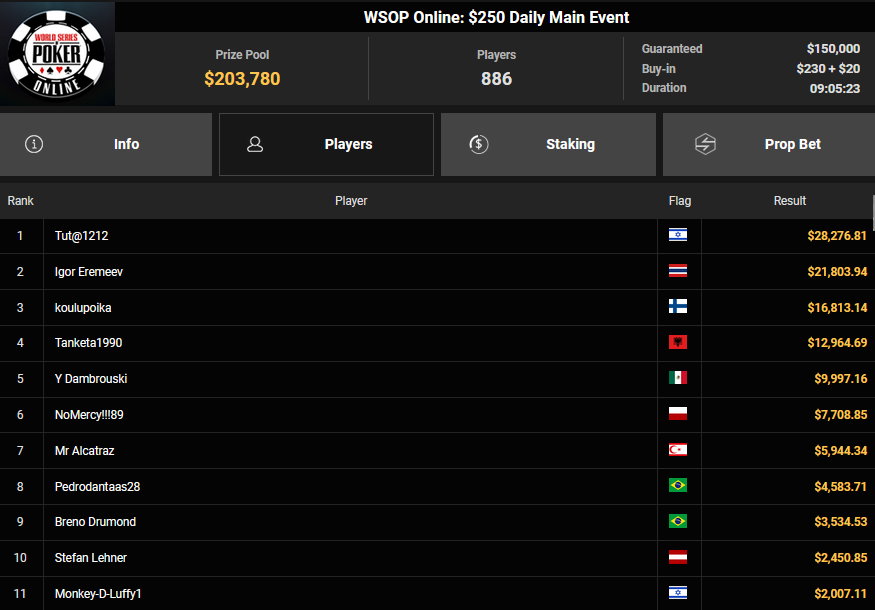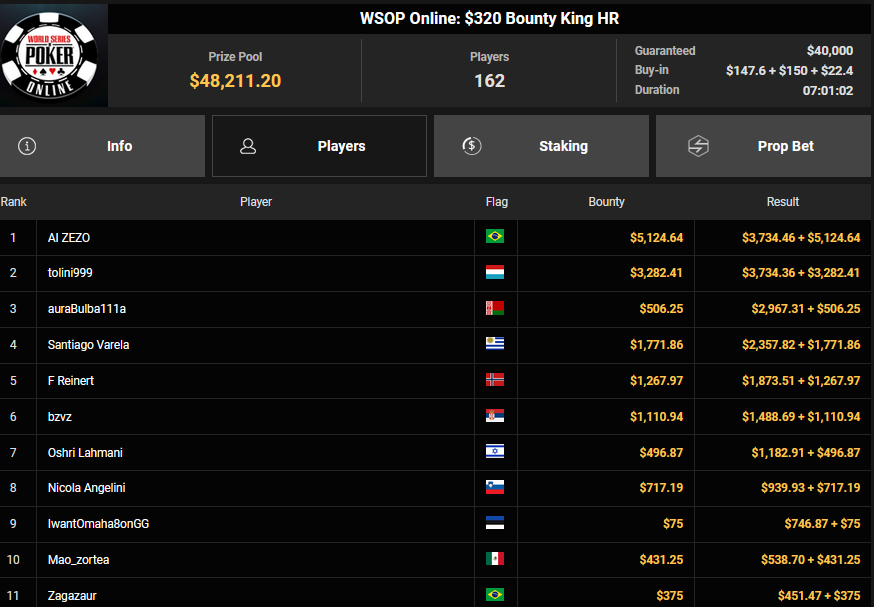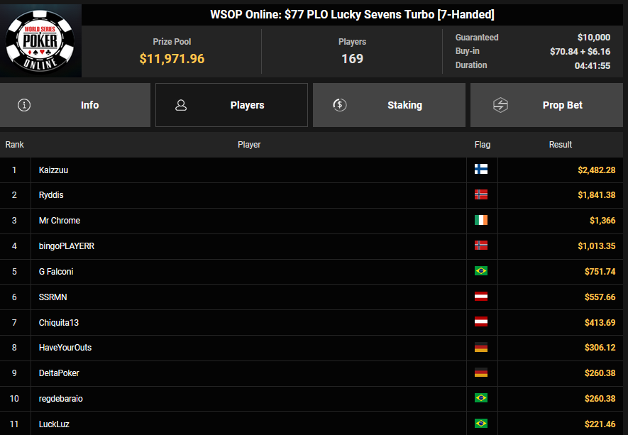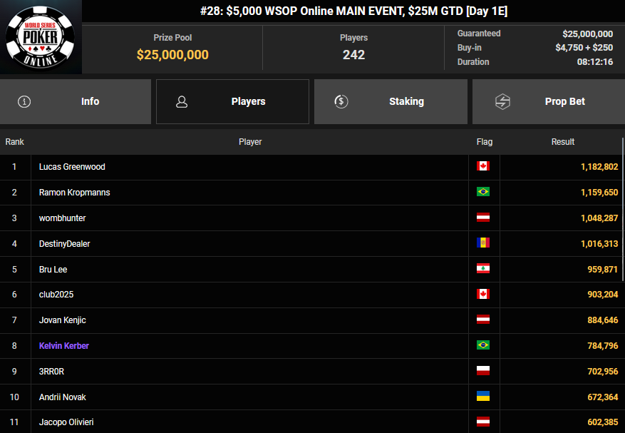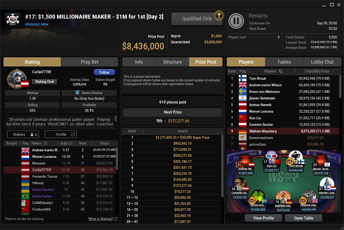 Gleich die nächste Chance auf ein Bracelet gibt es aber beim $1.500 Millionaire Maker. Hier hatten starke 5.920 Entries (4.695/1.225) für einen massiven Preispool von $8.436.000 gesorgt. mit noch 610 Spielern war es dann gestern in Tag 2 gegangen. Neun Spieler blieben am Ende übrig, Mathias Maasberg ist der letzte Deutsche – und der Shortstack. Alle haben bereits $127.277 sicher, der Sieger kann sich auf $1.271.600 + $30k WSOPP Super Pass freuen. Auch Simon Mattsson und Andras Nemeth spielen noch mit um das Bracelet.