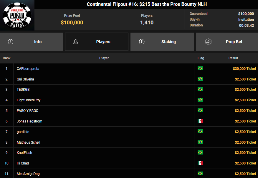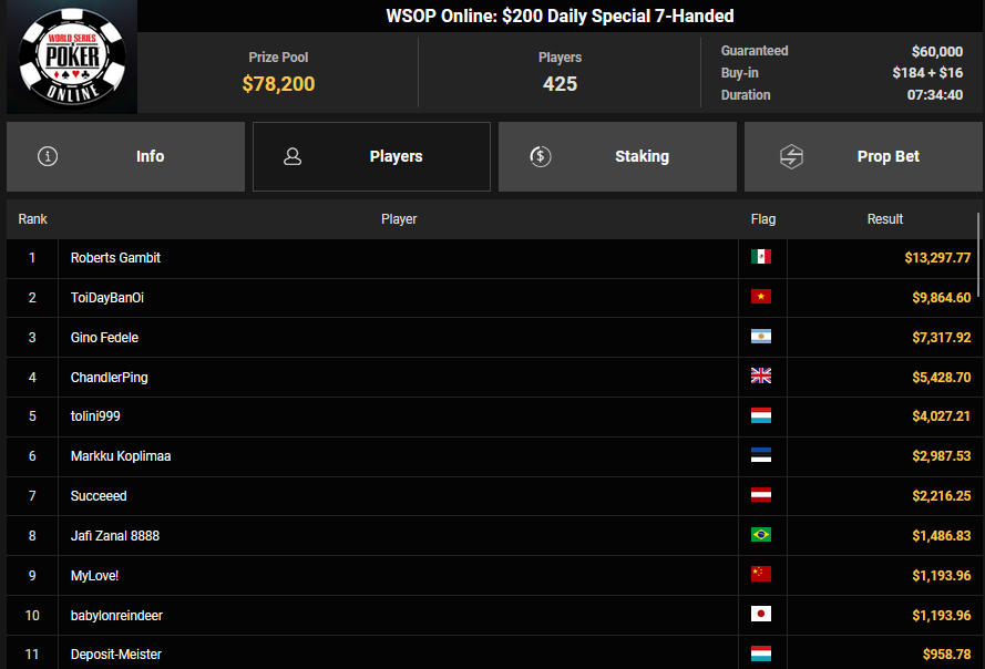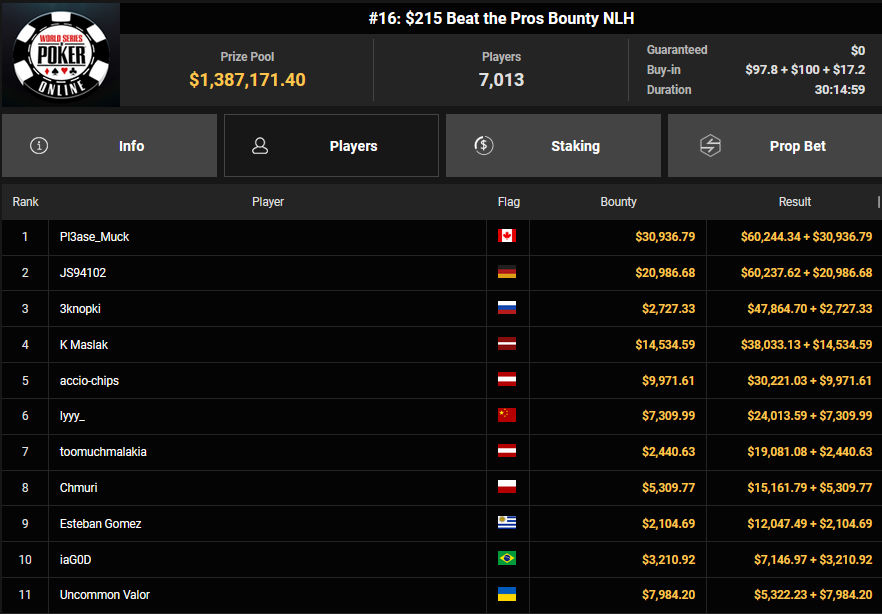 Von den 7.013 Entries beim $215 Beat the Pros (#16) war es mit noch 126 Spielern gestern ins Finale gegangen. Einige DACHs hatten noch Chancen und es war JS94102, der schließlich ins Heads-up kam. Hier musste sich der Deutsche aber Pl3ase_Muck geschlagen geben, Platz 2 zahlte $60.237 + $20.986. Der Sieg bescherte dem Kanadier $60.244 + $30.936 + $30k WSOPP Super Pass.
