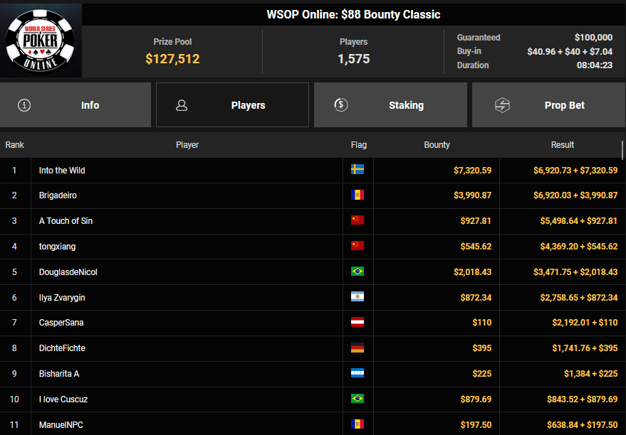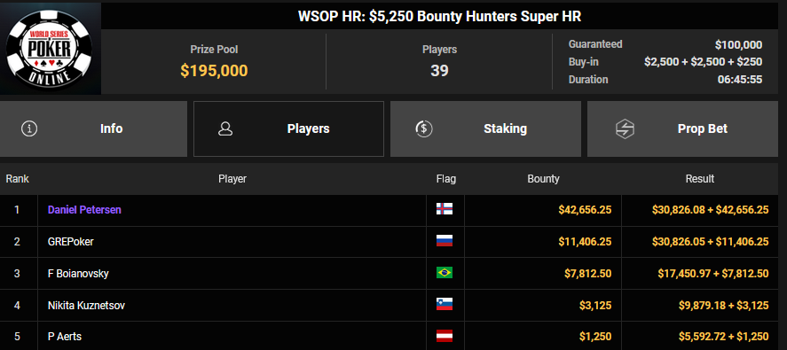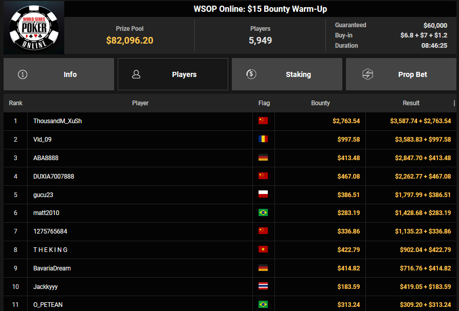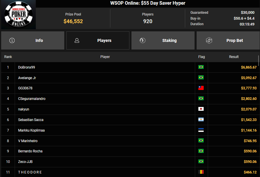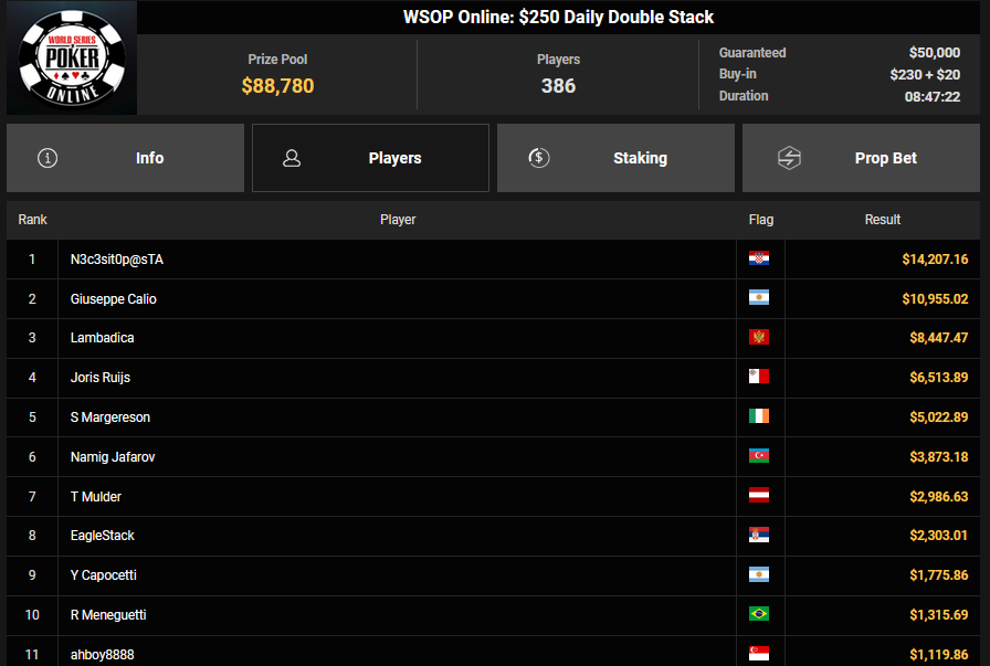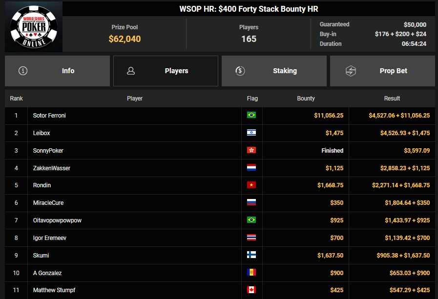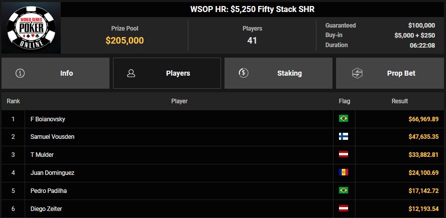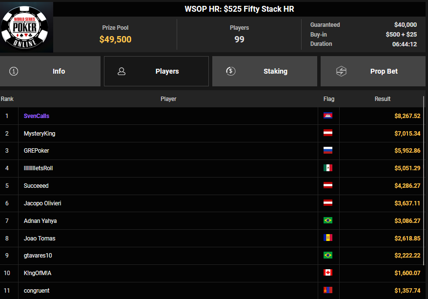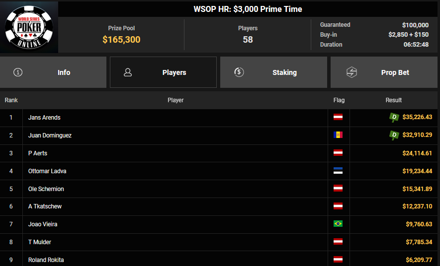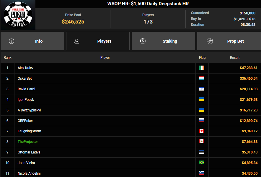 NoLove88 wurde beim $150 Daily Deepstack Runner-up für $21.673, auch OskarBet wurde beim $1.500 Daily Deepstack HR Runner-up für $36.460. MysteryKing schrammte beim $525 Fifty Stack HR am Sieg vorbei ($7.015), auch tolini999 wurde Runner-up beim $320 Bounty King HR ($3.734 + $3.282).