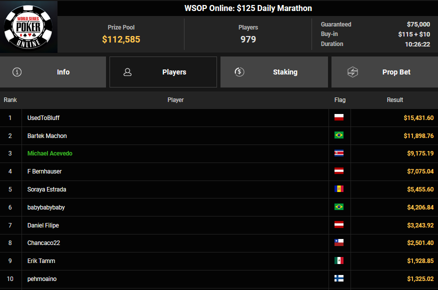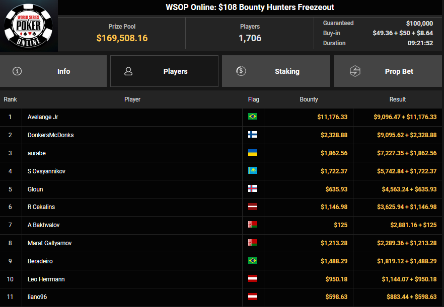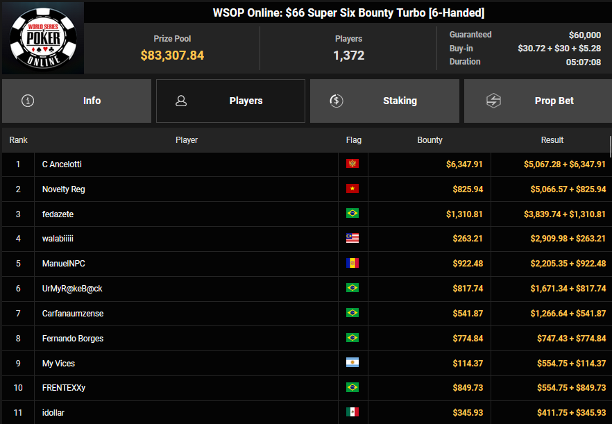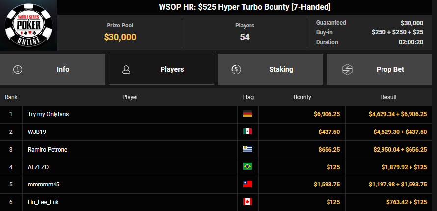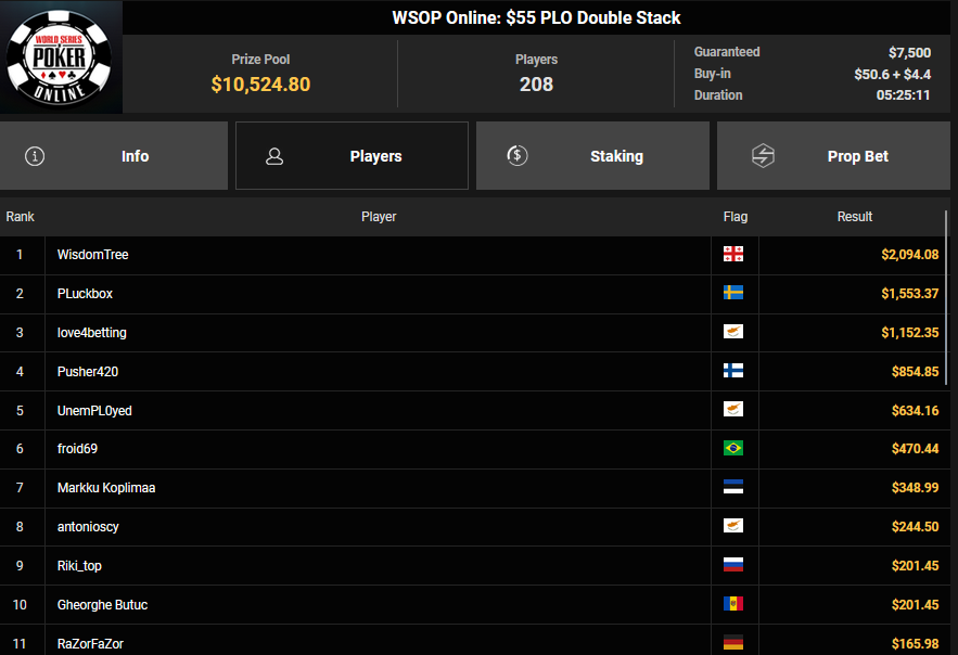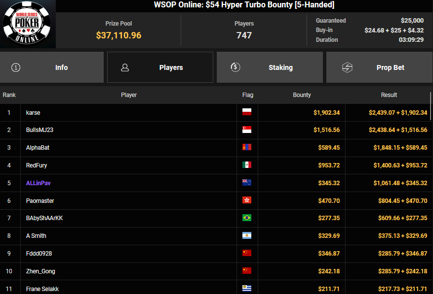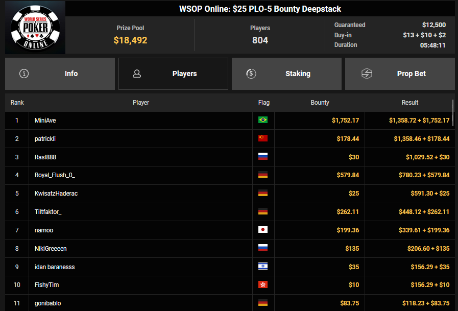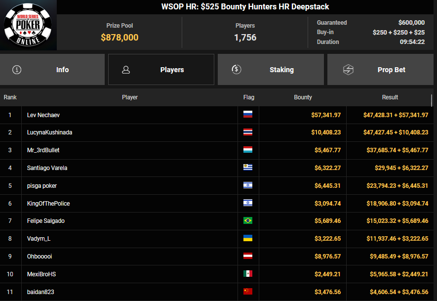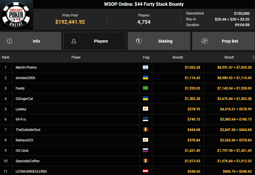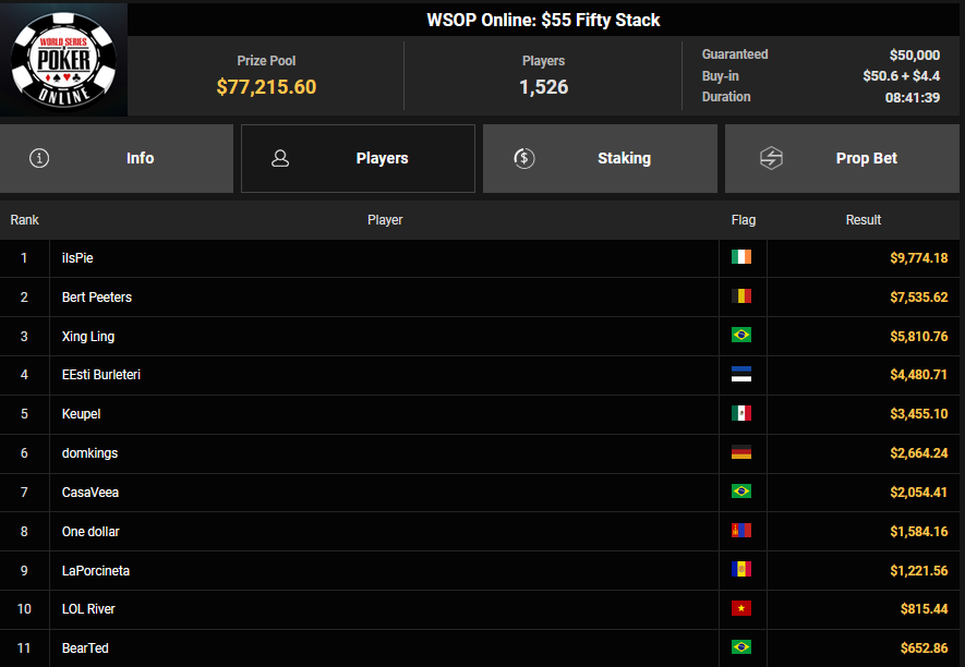 NoLove88 wurde beim $150 Daily Deepstack Runner-up für $21.673, auch OskarBet wurde beim $1.500 Daily Deepstack HR Runner-up für $36.460. MysteryKing schrammte beim $525 Fifty Stack HR am Sieg vorbei ($7.015), auch tolini999 wurde Runner-up beim $320 Bounty King HR ($3.734 + $3.282).