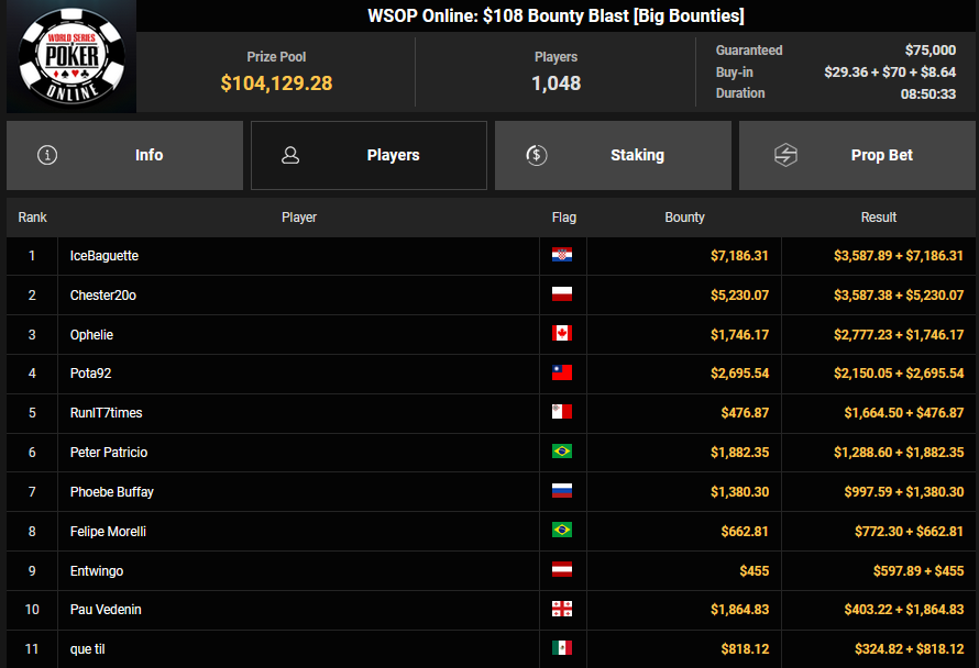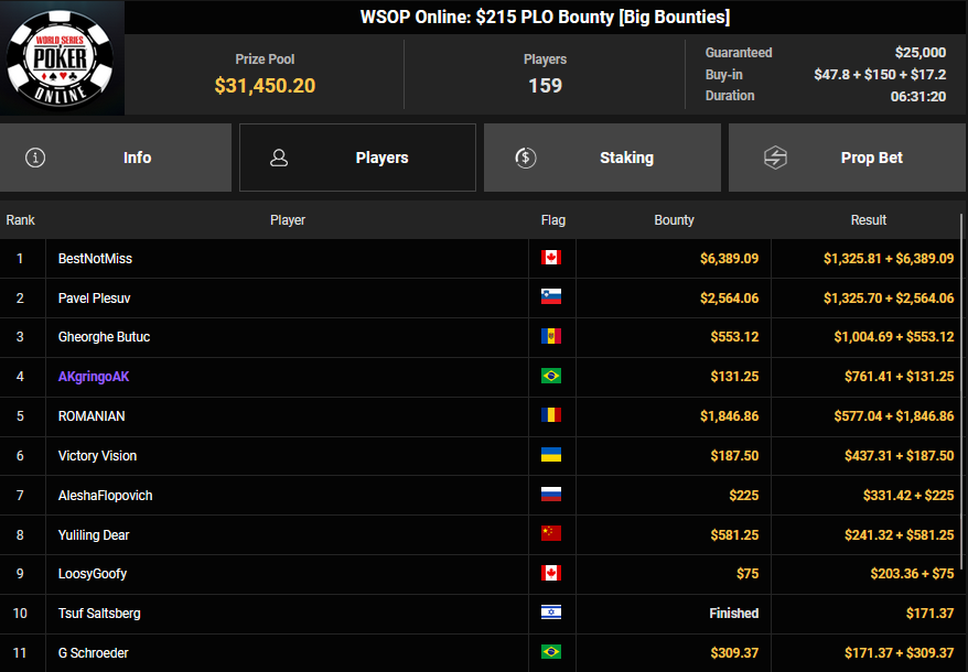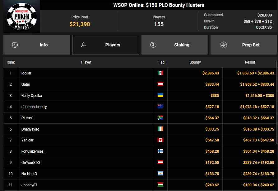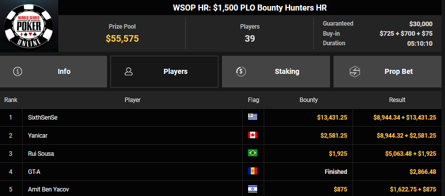 Gatiii belegte ebenfalls Rang 2 beim $150 PLO Bounty für $1.868 + $833, ViBe1 teilte das Schicksal beim $1.050 Heater HR ($8.853 + $3.875).