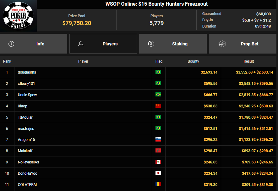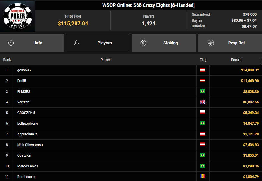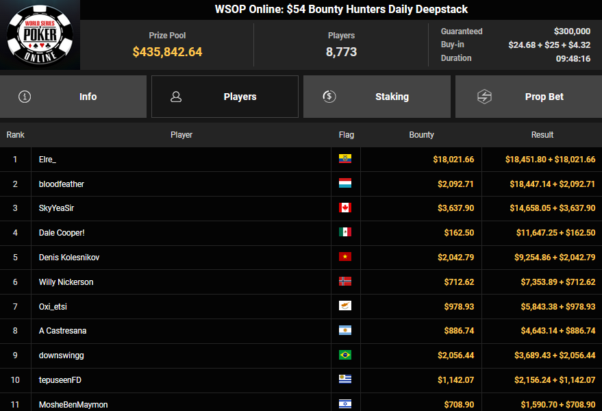 gosho86 siegte beim $88 Crazy Eights für 14.848, Frutilt belegte Rang 2 für $11.448. bloodfeather kassierte $18.447 + $2.092 für Platz 2 beim $54 Bounty Hunters Daily Deepstack, Mr_3rdBullet belegte bei der $525 Bounty Hunters HR Ausgabe Rang 3 für $37.685 + $5.467.