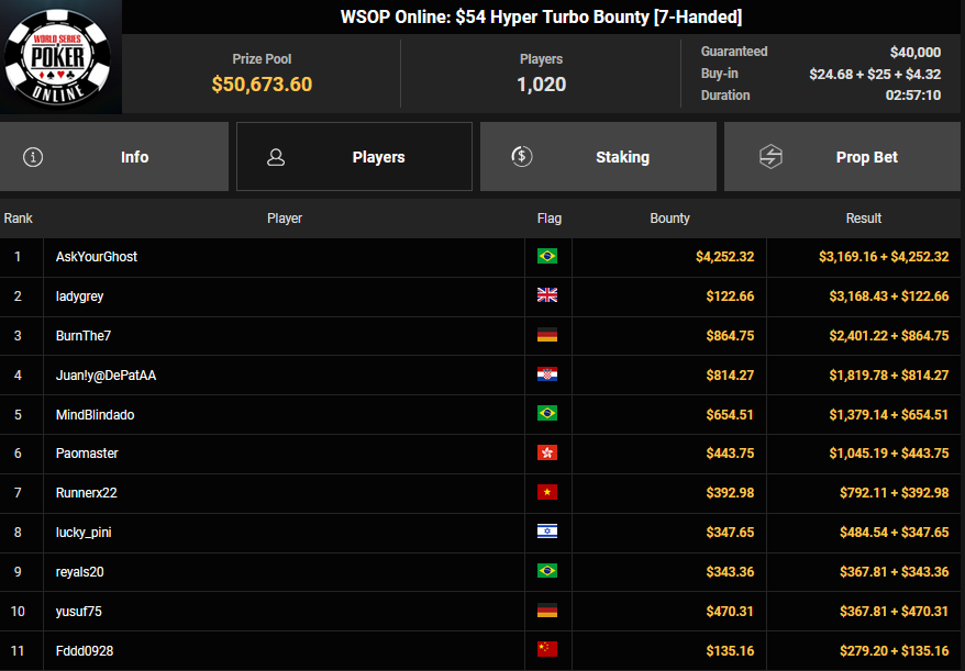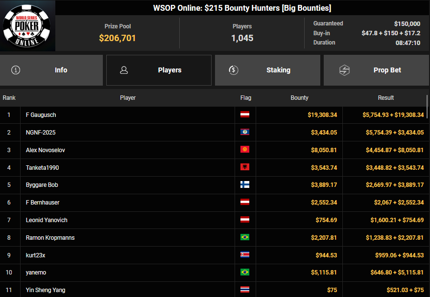 Fast hätte es mit dem deutschen Bracelet beim $215 Beat The Pros Bounty der World Series of Poker (WSOP) Online 2025 auf GGPoker geklappt, JS94102 musste sich dann aber im Heads-up geschlagen geben. Florian Gaugusch war dafür wieder bei den Side Events erfolgreich.