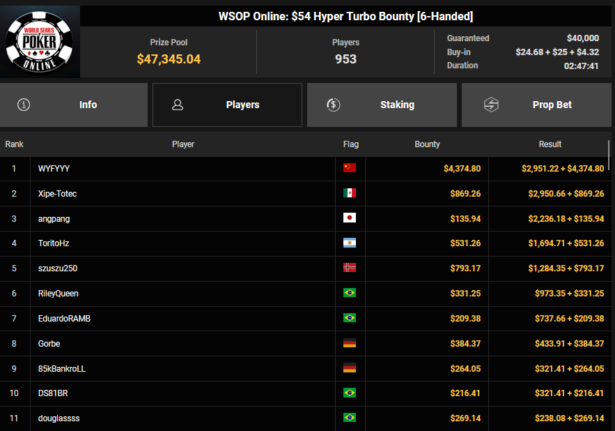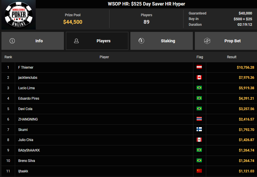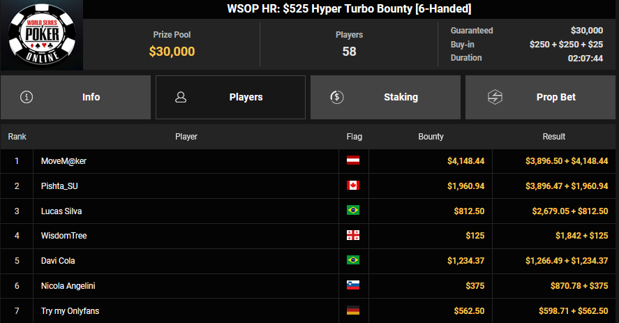 Zu später Stunde war Frederik Thiemer beim $525 Day Saver HR erfolgreich und kassierte $10.756, BurnThe7 holte Rang 3 beim $54 Hyper Turbo ($2.401 + $864), während Try my Onlyfans den Sieg beim $525 Hyper Turbo Bounty ($4.629 + $6.906) einfuhr. Auch MoveM@ker verbuchte noch den Sieg beim $525 Hyper Turbo ($3.896 + $4.148).