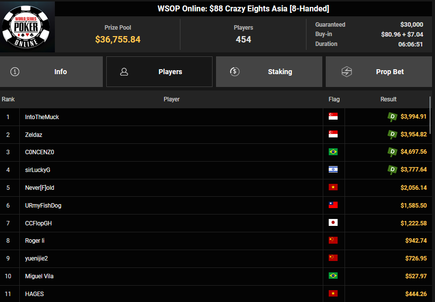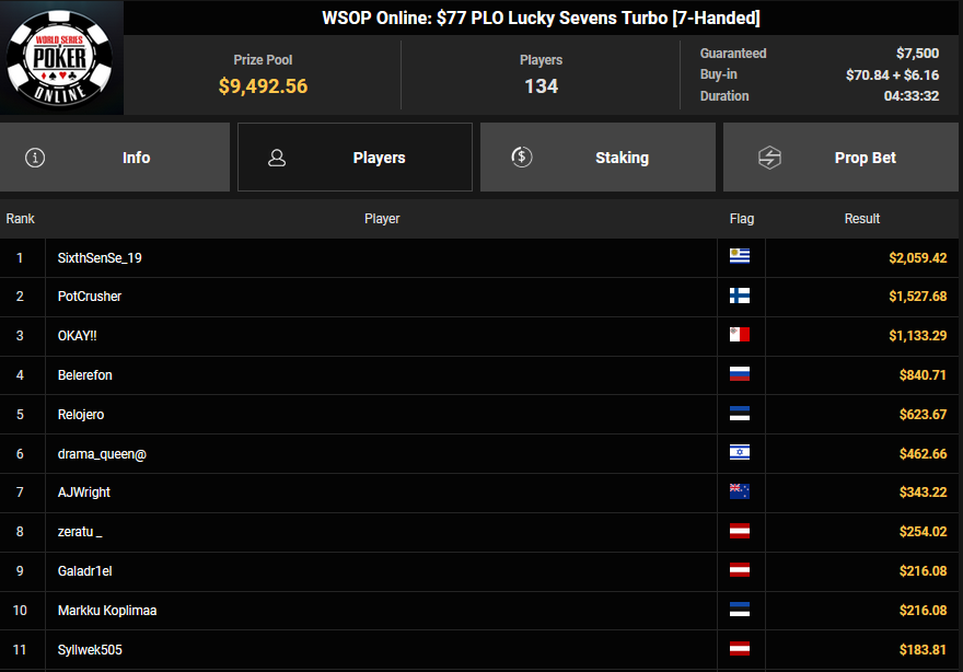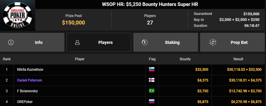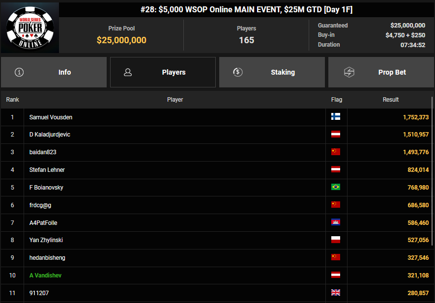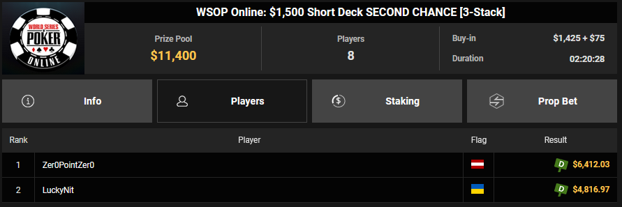 Deutlich kleiner war natürlich das Feld bei der $5.000 Short Deck Championship (#18). 89 Entries sorgten hier für $422.750 imPot, der Sieger wird hier mit $99.169 + $30k WSOPP Super Pass vom Tisch gehen. Deutschsprachigen Sieger wird es definitiv keinen geben, Evgenii Akimov ist der Chipleader der letzten sieben Spieler.