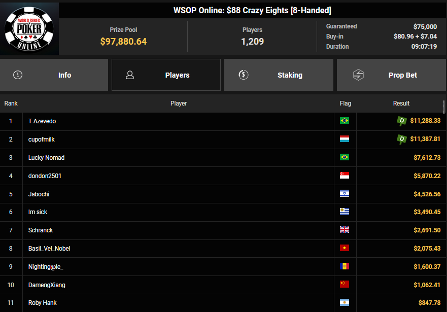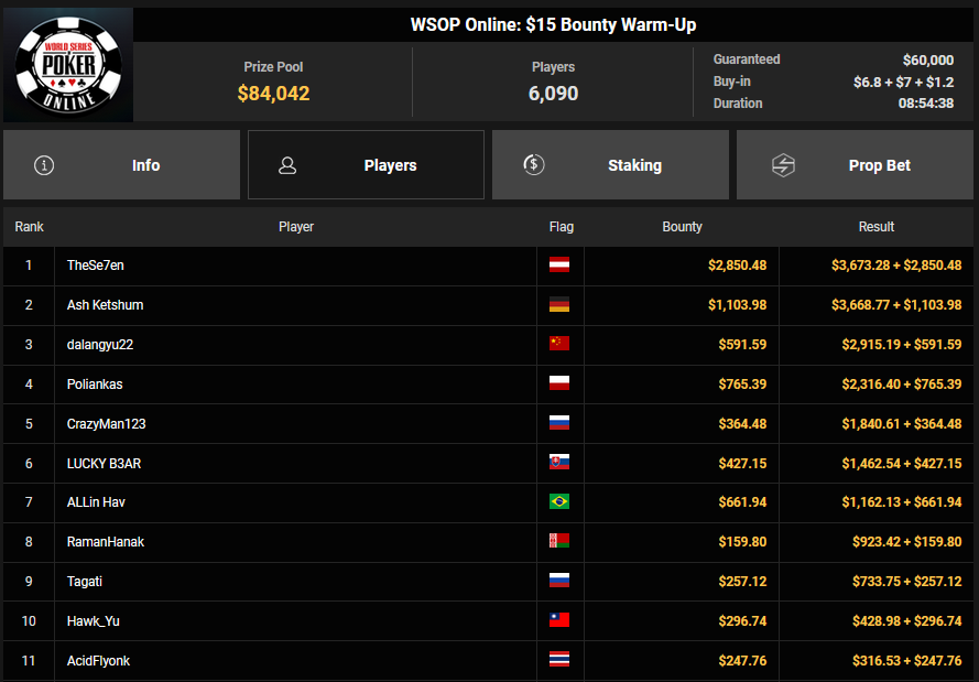 Dafür passte auch gestern wieder die Side Event Bilanz für die DACHs. TheSe7en siegte beim $15 Bounty WArm-up für $3.673 + $2.850, Ash Ketshum wurde Runner-up für $3.668 + $1.103. Syllwek505 setzte sich beim $55 PLO Double Stack durch und kassierte $2.194. Bei $88 Crazy Eights teilte cupofmilk, was dem Luxemburger $11.387 für Platz 2 bescherte.