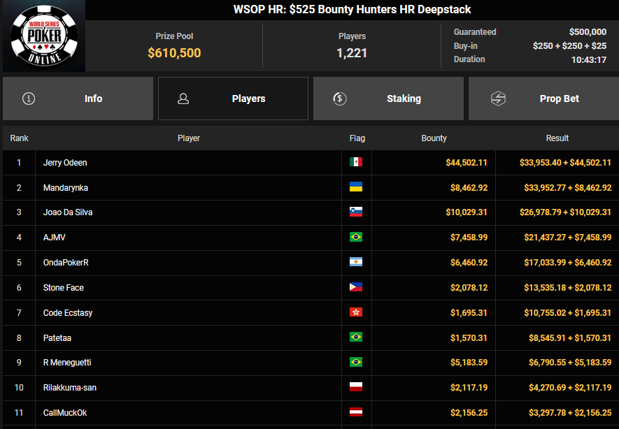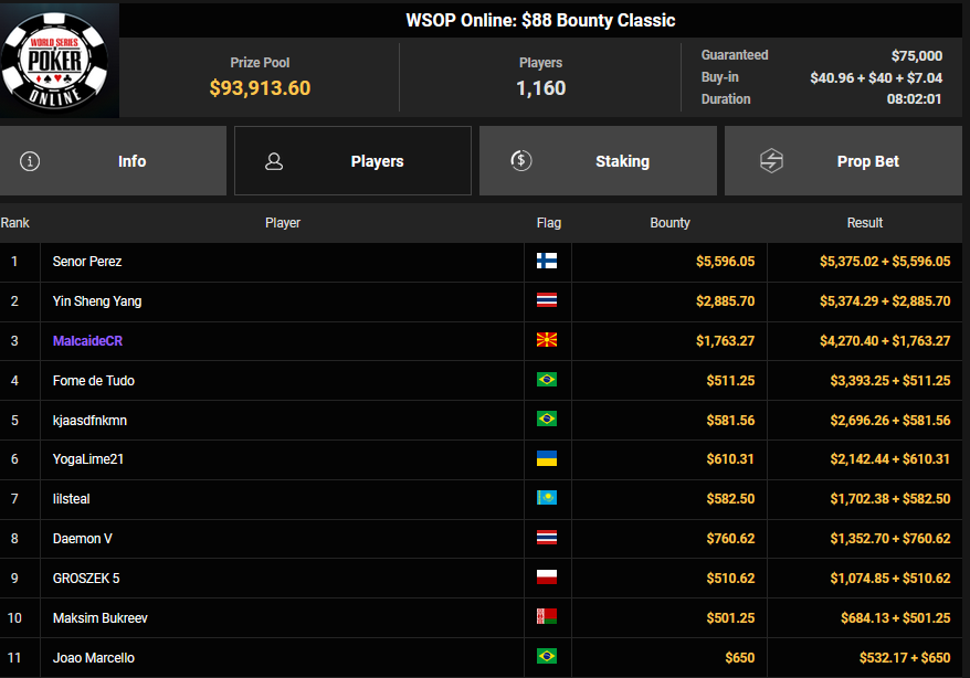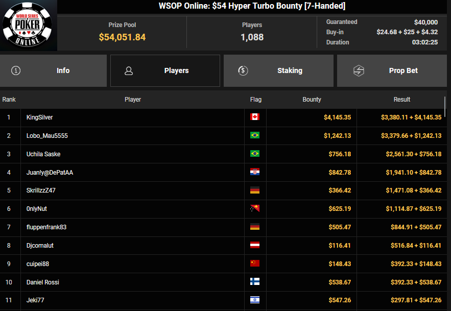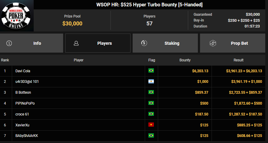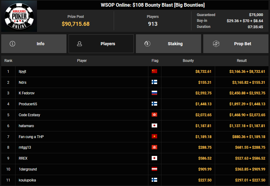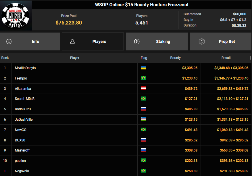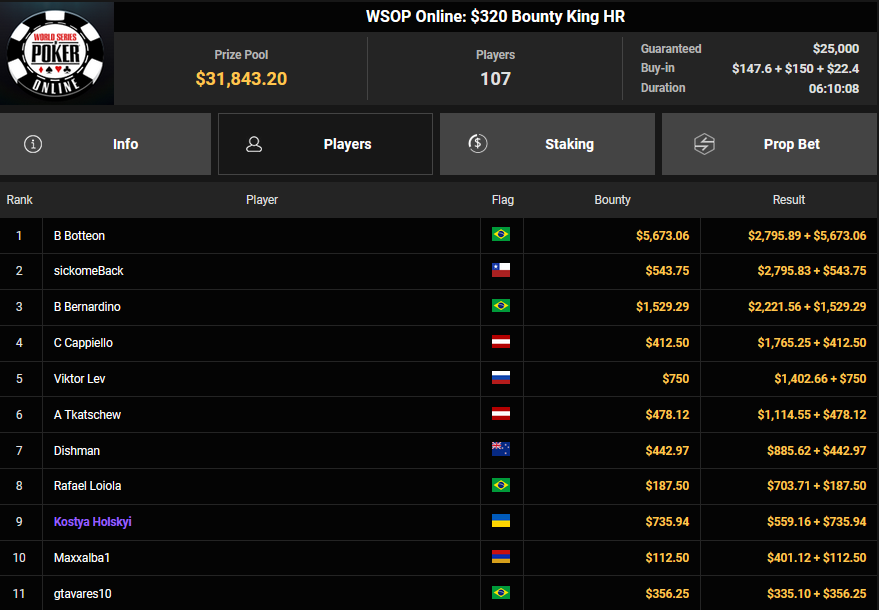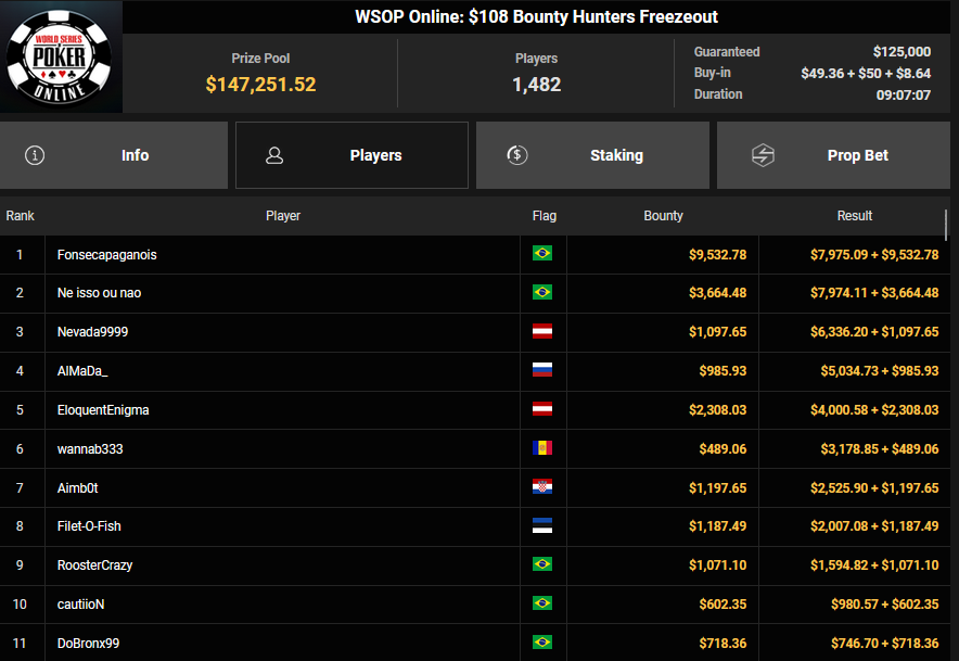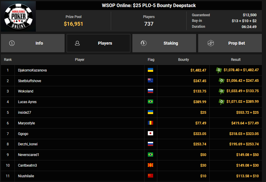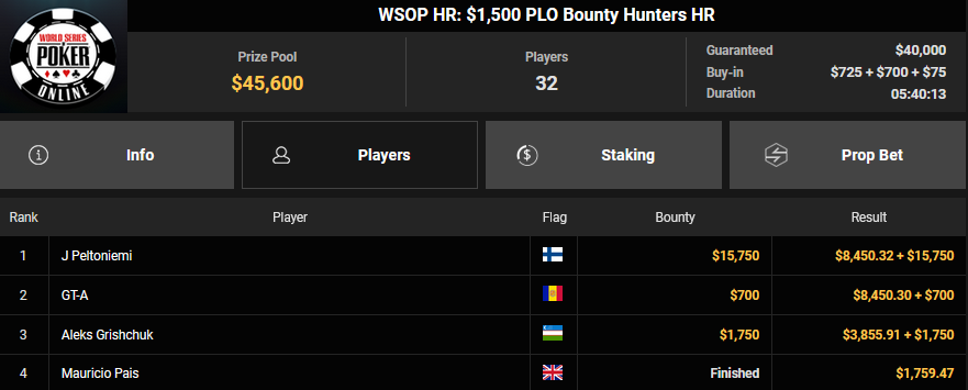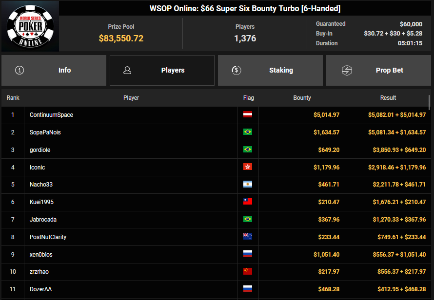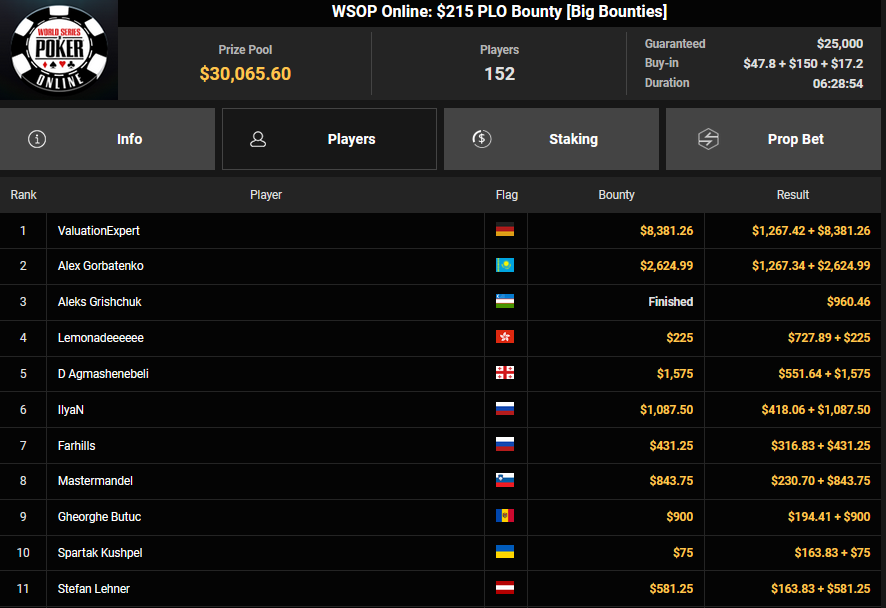 ValuationExpert konnte sich das $215 PLO Bounty ($1.267 + $8.381) sichern, Alkaramba wurde Dritter beim $15 Bounty Hunters für $2.659 + $439. Nevada9999 konnte Platz 3 beim $108 Bounty Hunters Freezeout für $6.336 + $1.097 erobern, Clickwork kam beim $525 Fifty Stack HR auf Rang 3 für $4.303.
