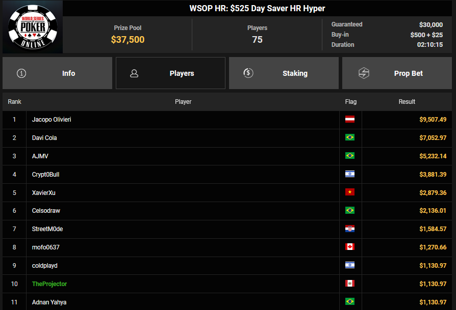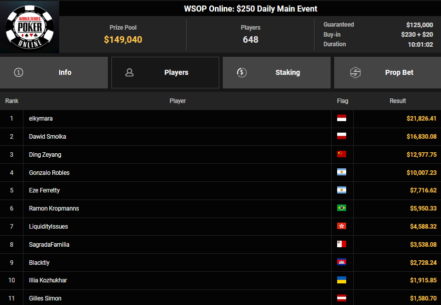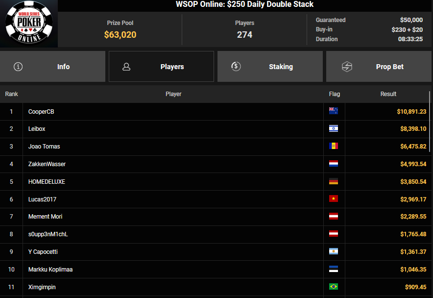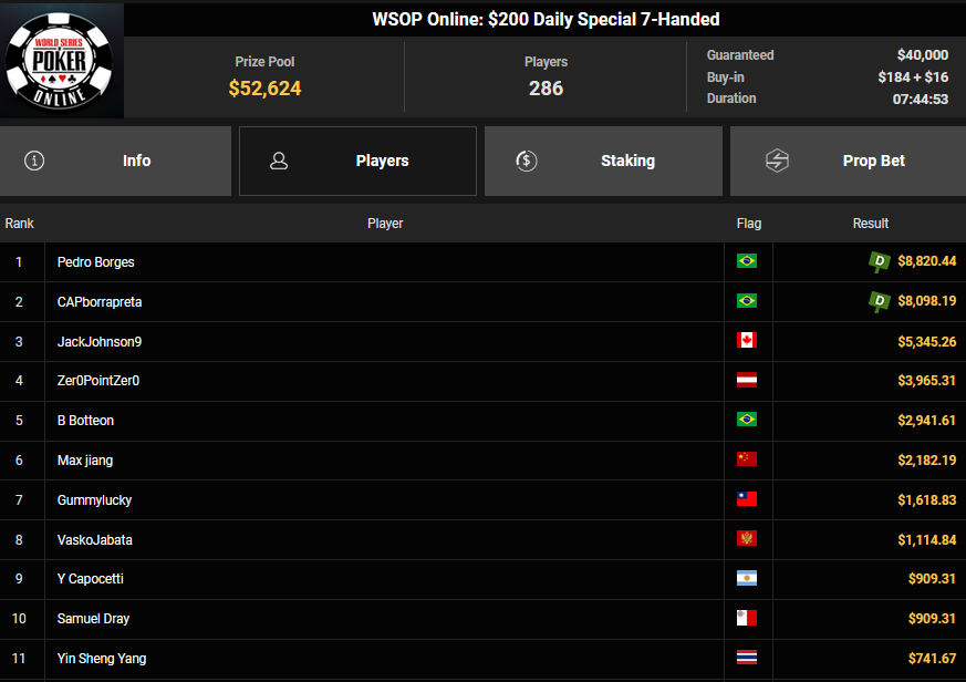 Gestern ging es für noch neun Spieler der 5.920 Entries (4.695/1.225) beim $1.500 Millionaire Maker ins Finale. $1.271.600 + $30k WSOPP Super Pass warteten auf den Sieger, MarioBuildreps war der letzte Deutsche im hochkarätigen Finale. Für ihn sollte es dann aber nicht mehr als Rang 9 für $127.277 werden. Die beiden Österreich-Fahnen waren keine deutschsprachigen Spieler. Simon Mattsson war neben Andras Nemeth auf jeden Fall der bekannteste Spieler am Final Table, der schwedische Online-Grinder – bekannt als „C. Darwin2“ – konnte sich durchsetzen und das Bracelet holen.