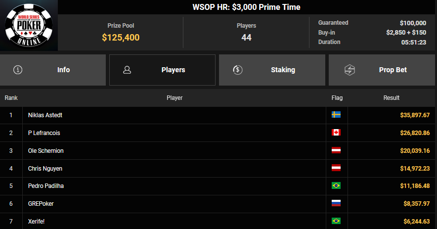 Niklas Astedt triumphierte beim $3.000 Prime Time ($35.897), Ole Schemion kam hier auf Rang 3 ($20.039) und auch für Chris Nguyen auf Rang 4 gab es noch Kleingeld ($14.972).