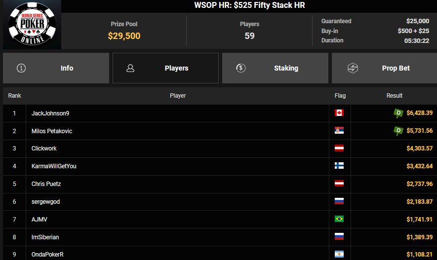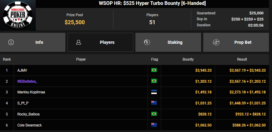 Beim $5.250 Fifty Stack HR waren es 36 Entries, im Heads-up teilten Leon Sturm ($52.444) und Ole Schemion ($44.184). GGwpFML konnte für Rang 2 beim $32 Bounty King $4.287 + $1.794 mitnehmen, Zer0PointZer0 holte das $1.500 Short Deck Second Chance für $6.412. WOW WOJO konnte sich den Sieg und $4.290 + $5.573 beim $108 Daily Heater Bounty sichern, ContinuumSpace schnappte sich das $66 Super Six Bounty ($5.082 + $5.014) und OnYourBik3 war dann auch noch beim $55 Day Saver ($6.589) erfolgreich.
