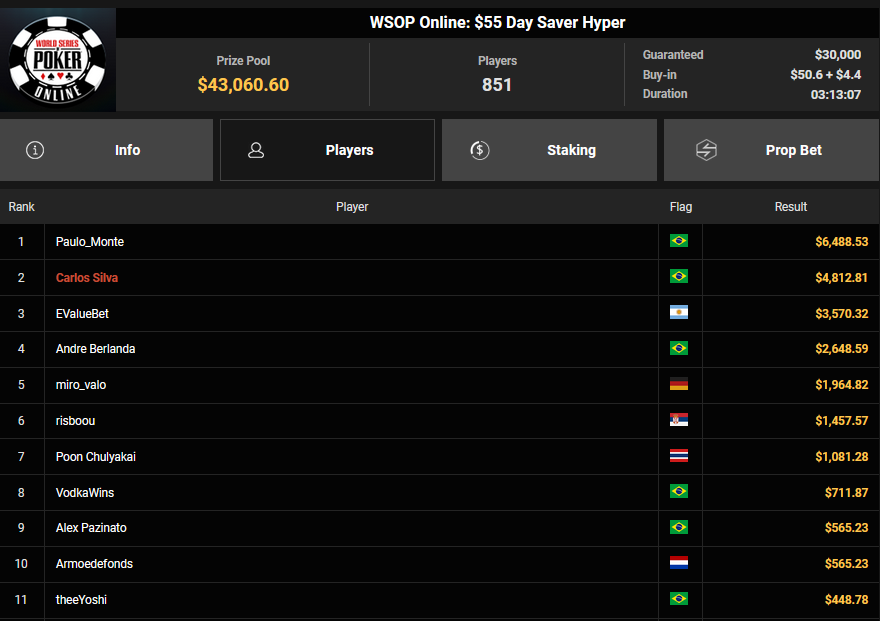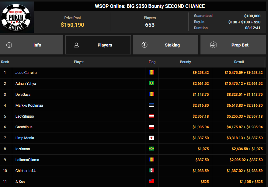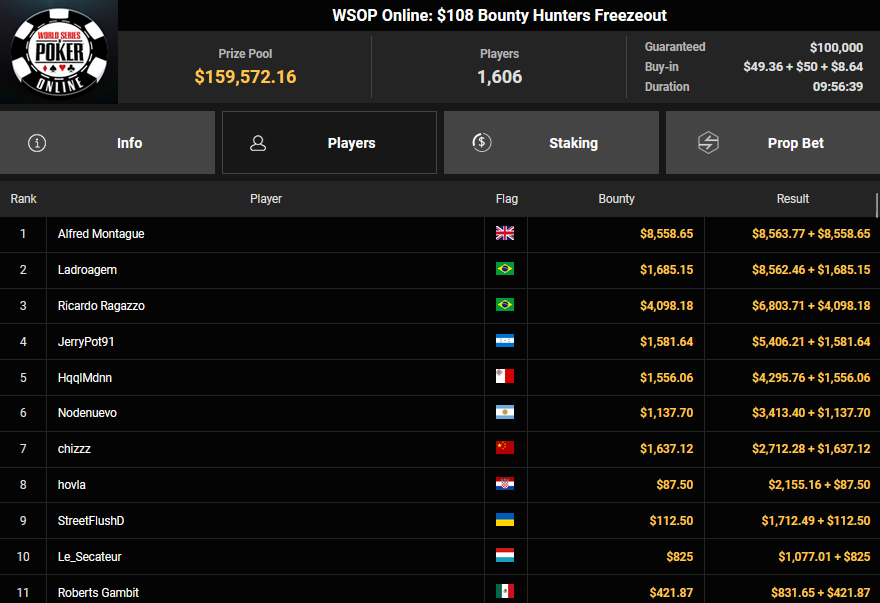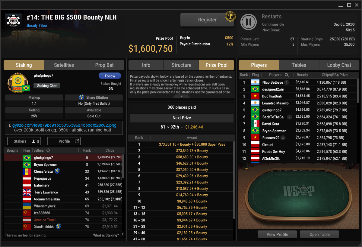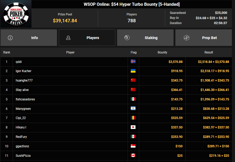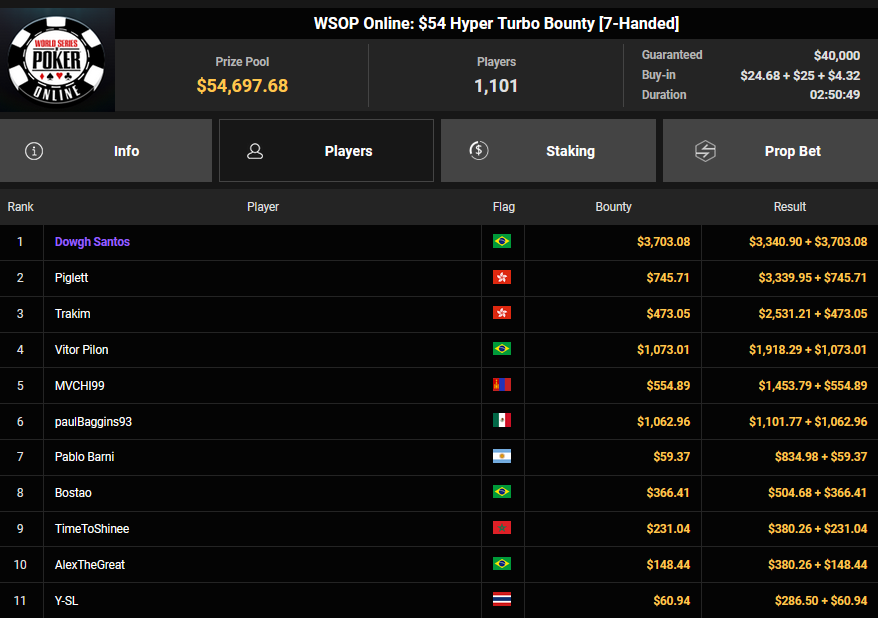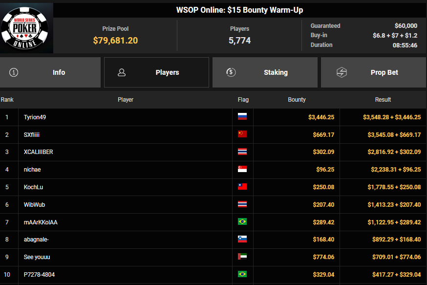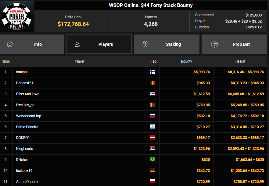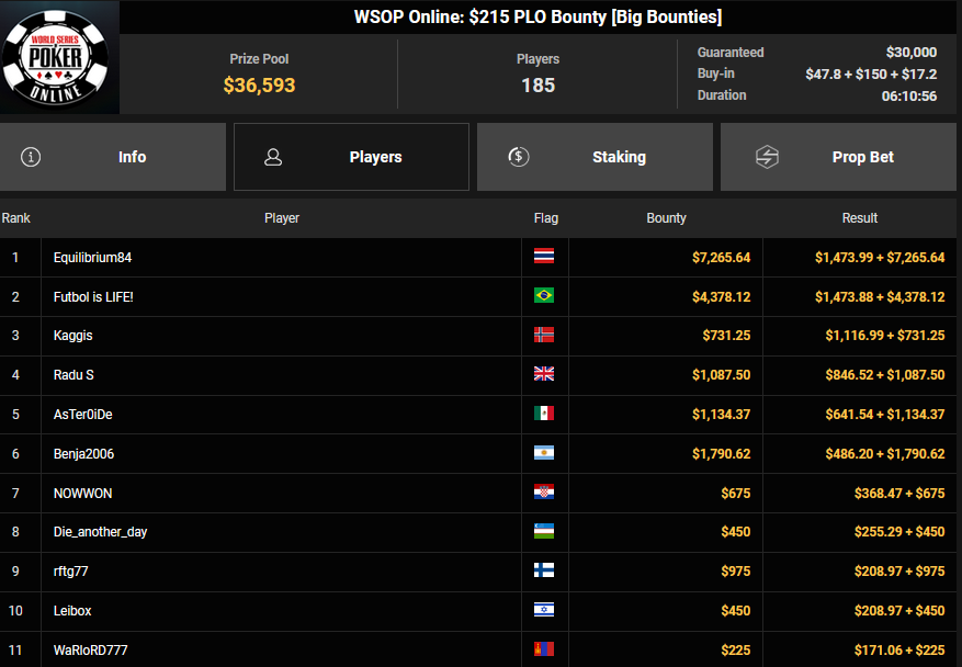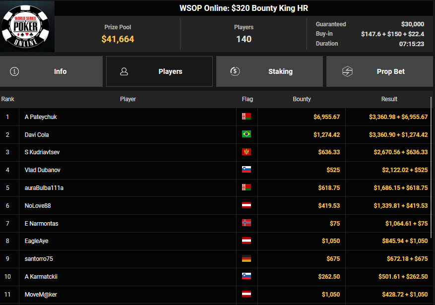 Das $500 The Big $500 Bounty (#14) brachte starke 3.370 Entries und einen Preispool von $1.600.750. Noch sind es 67 Spieler, die heute ins Finale starten, einige DACH-Spieler sind noch dabei und können auf die Siegprämie von $73.851 + Bounty + $30k WSOPP Super Pass hoffen.