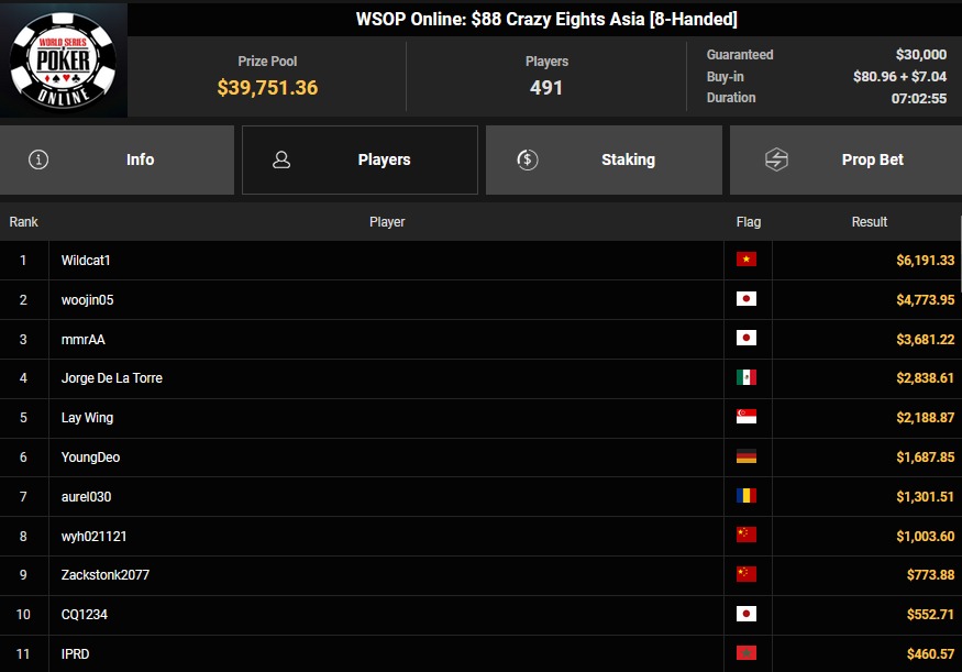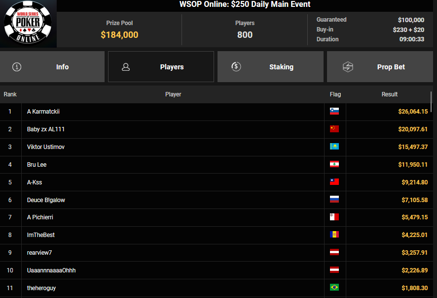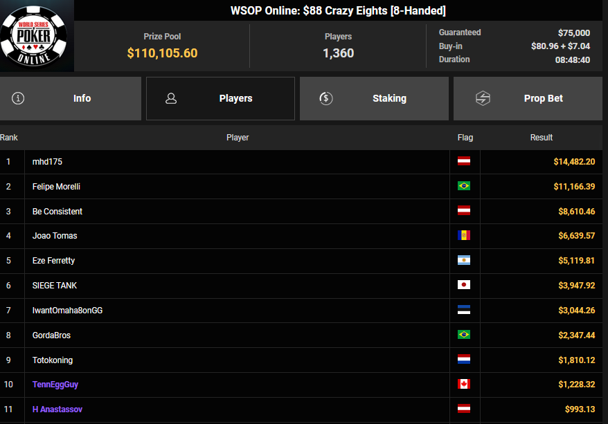 Lunima kam beim $55 PLO Double Stack auf Rang 3 für $1.207, Steve-Ohhh! wurde beim $200 Daily Special Runner-upf ür $7.985. mhd175 konnte den Sieg beim $88 Crazy Eights für $14.482 holen, Be Consistent kau auf Rang 3 für $8.610.