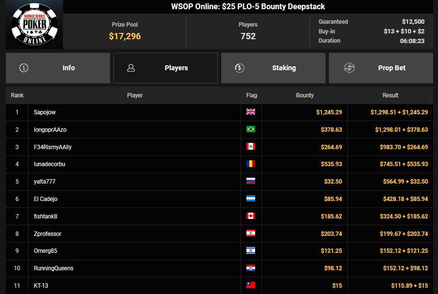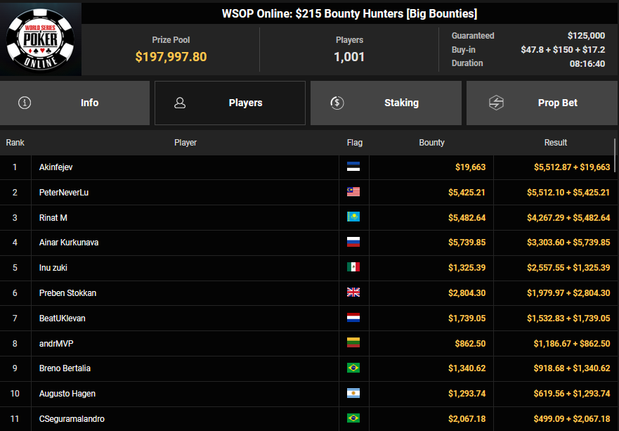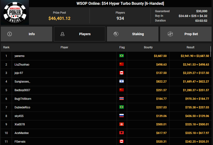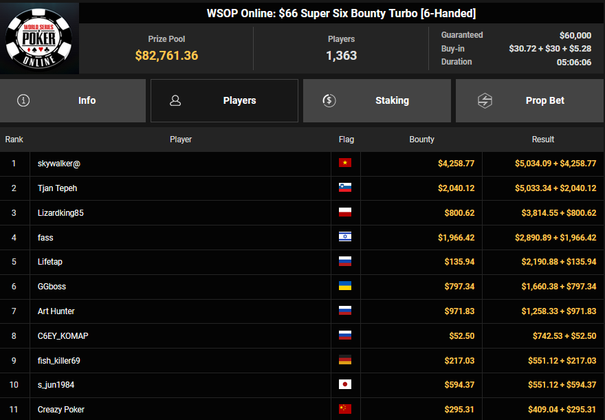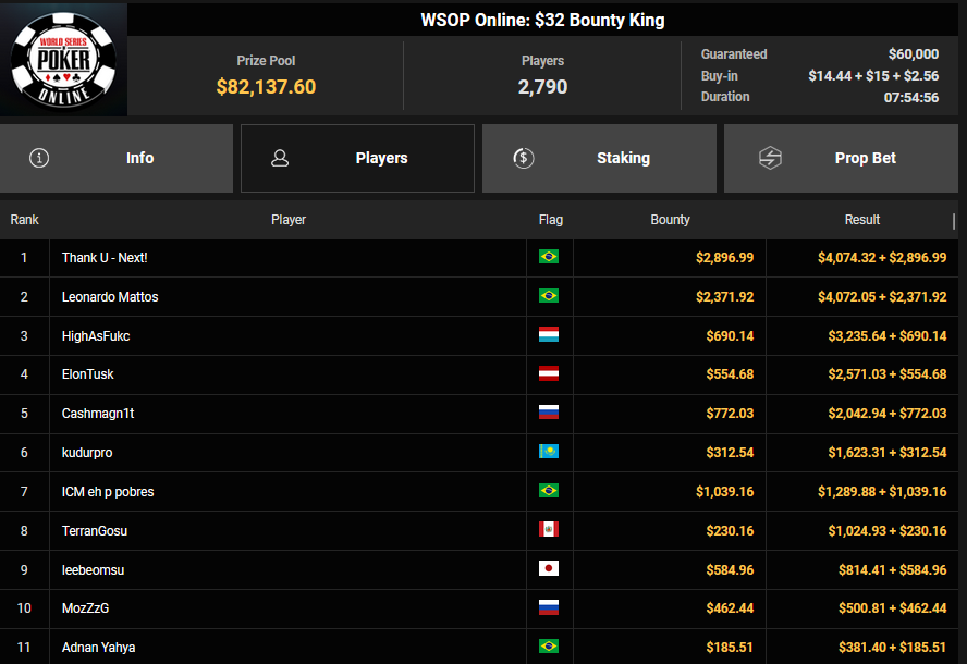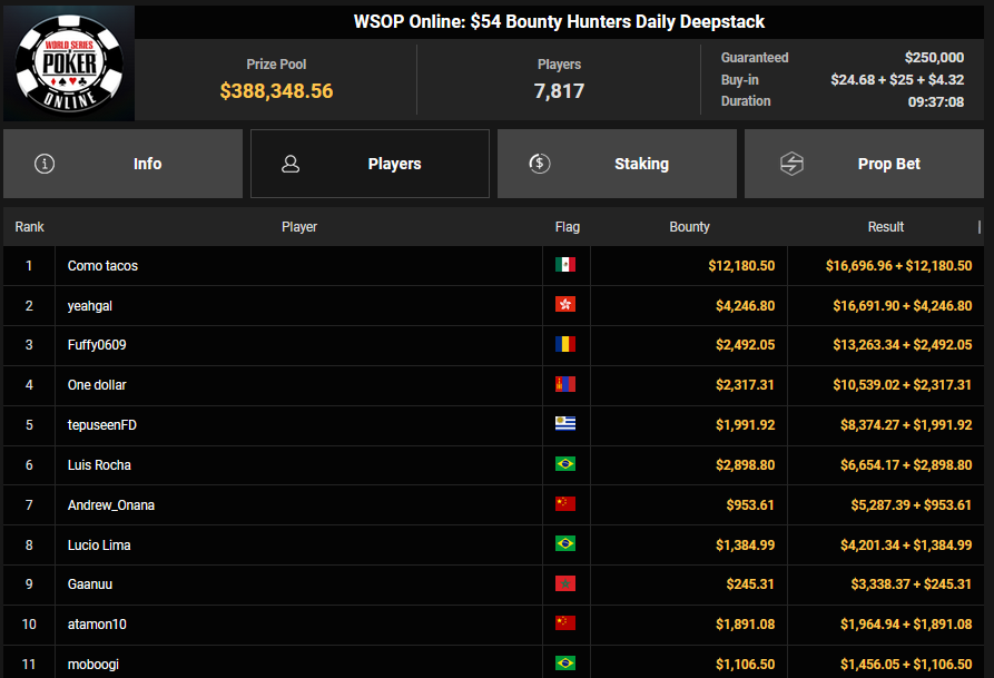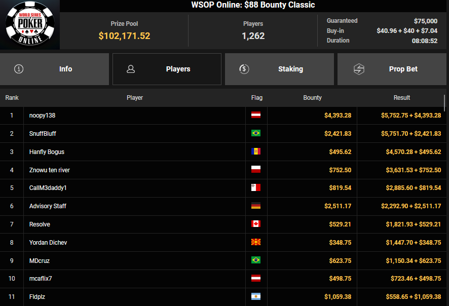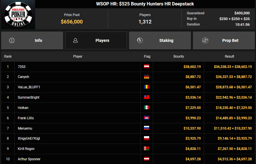 7353 siegte beim $525 Bounty Hunters HR für $36.338 + $38.602, Canyoh konnte für Platz 2 noch $36.337 + $8.887 mitnehmen. MuKing wurde Runner-up beim $55 Fifty Stack und nahm $7.107 mit.
