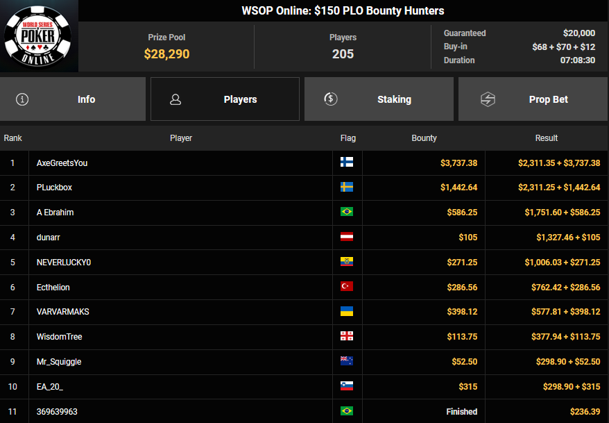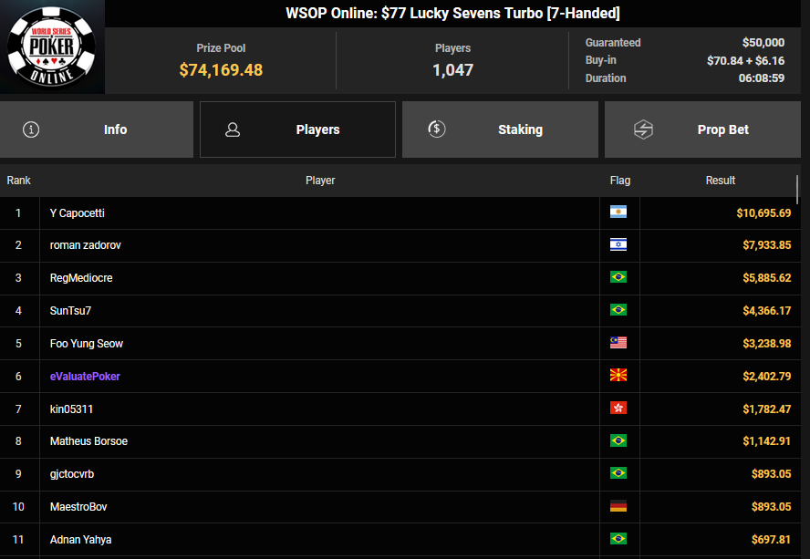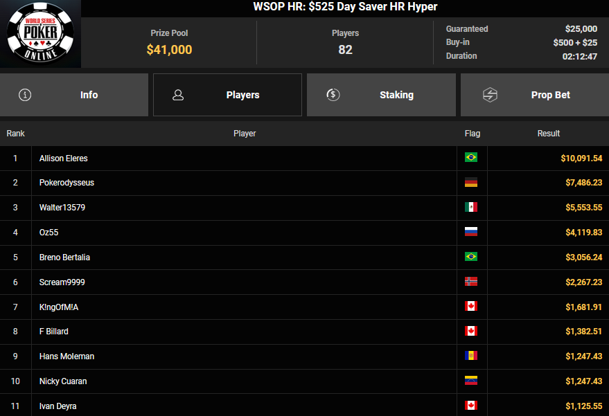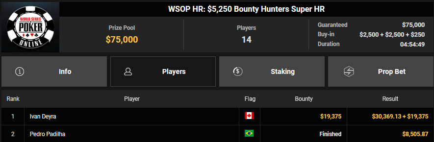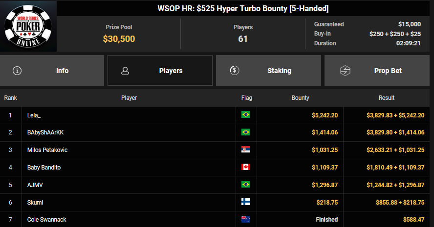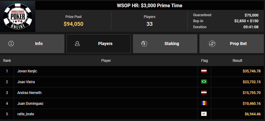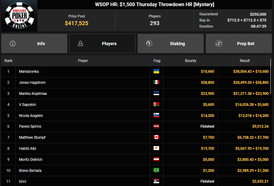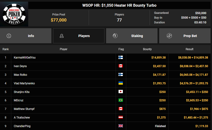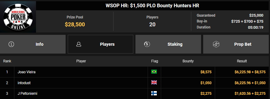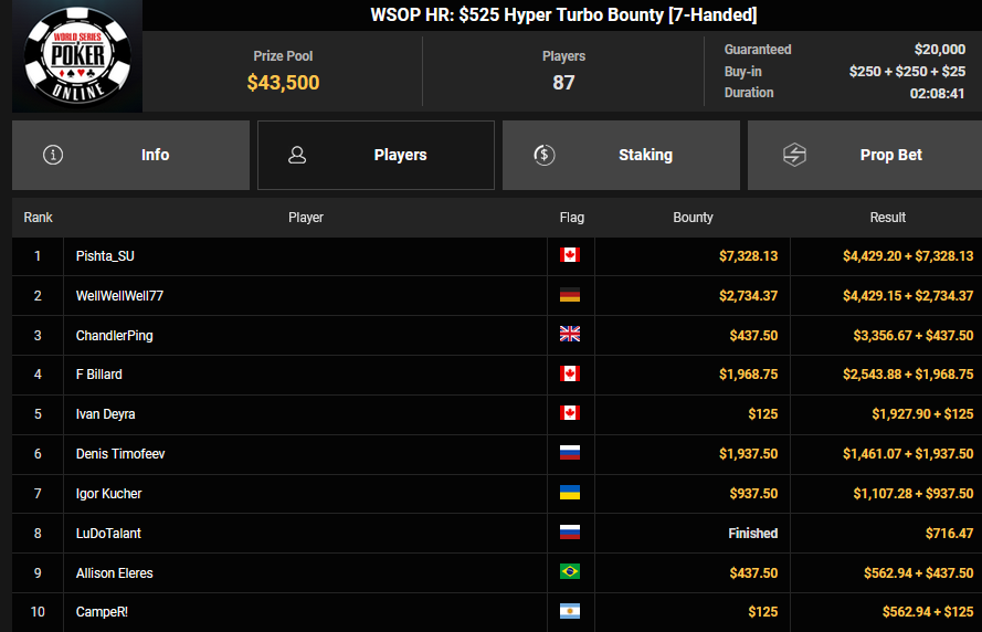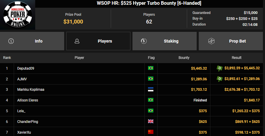Pokerodysseus beendete seine Irrfahrt beim $525 Day Saver HR auf Rang 2 und kassierte $7.486, WellWellWell77 verpasste beim $525 Hyper Turbo Bounty den Sieg, Platz 2 zahlte $4.429 + $2.734.