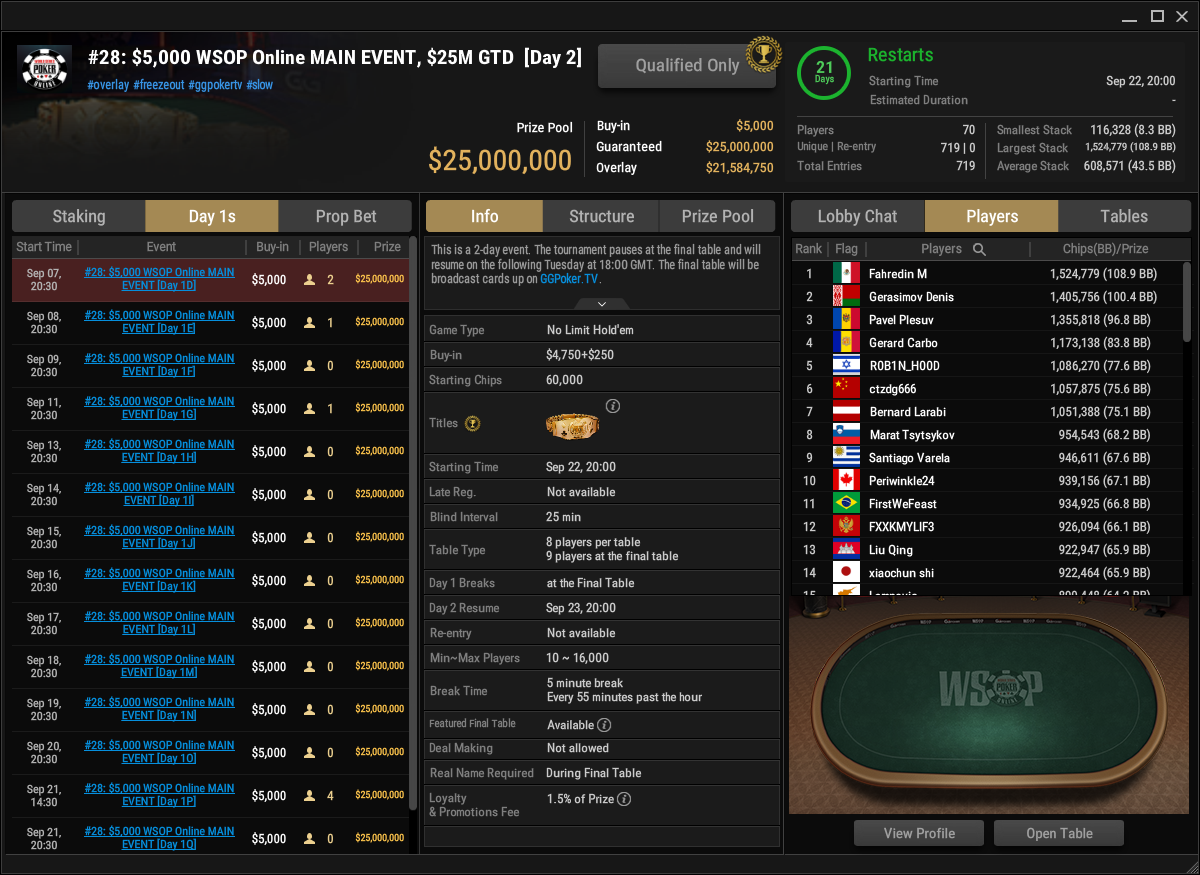 Heute gibt es die letzten Flights beim $500 Mini Main Event ($4.000.000 GTD), ehe es in Tag 2 geht. Schaut auf jeden Fall immer auf die Satellites, um euch bankroll-schonend zu den Turniertickets zu spielen. Turniere & Satellites sind im Client im „WSOP“ Tab zu finden, alle Infos zu den Events gibt es auch auf den Seiten von GGPoker.