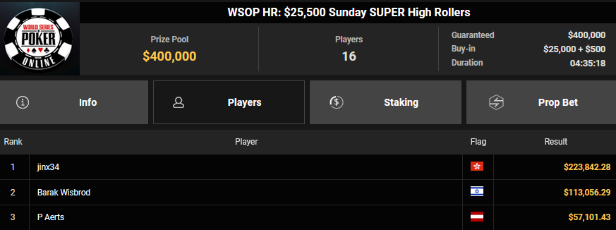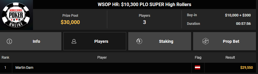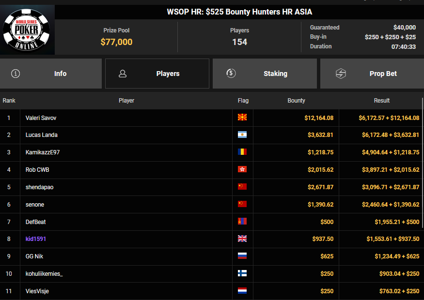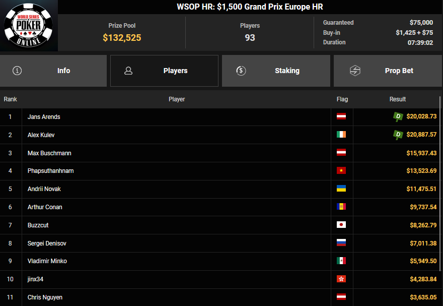 Karlovic77 sicherte sich beim $88 Bounty Warm-up $10.152 + $4.708 für Rang 3, Max Buschmann wurde beim $1.500 Grand Prix Europe HR Dritter für $15.937. Der Niederländer Jans Arends teilte mit Alex Kulev und holte den Sieg für $20.028.