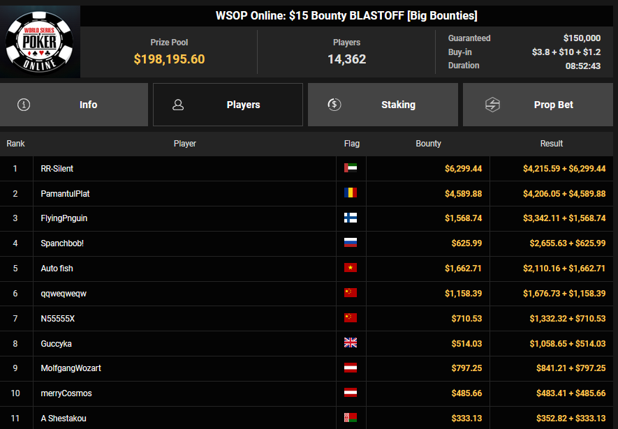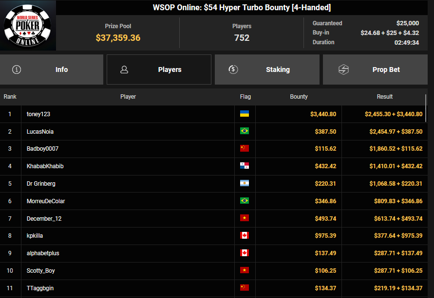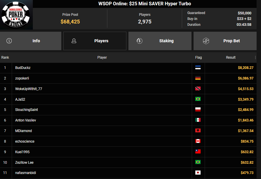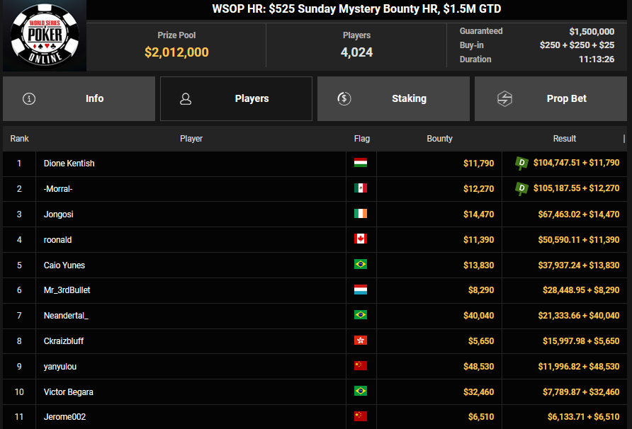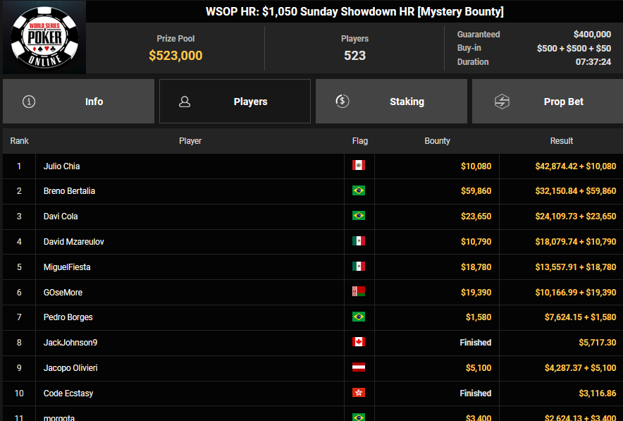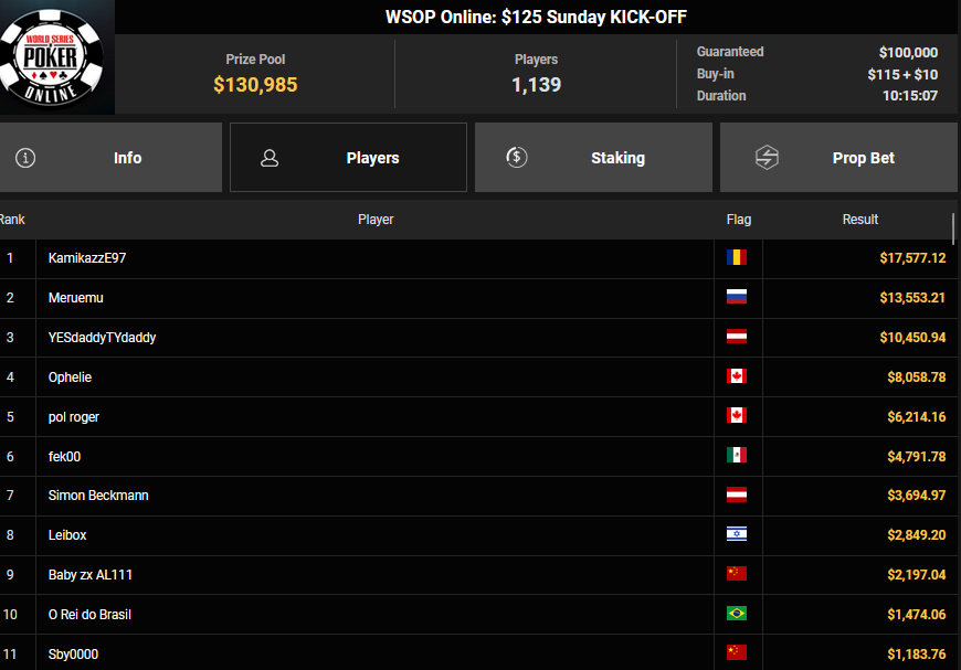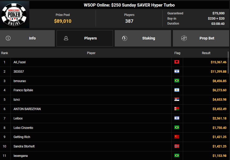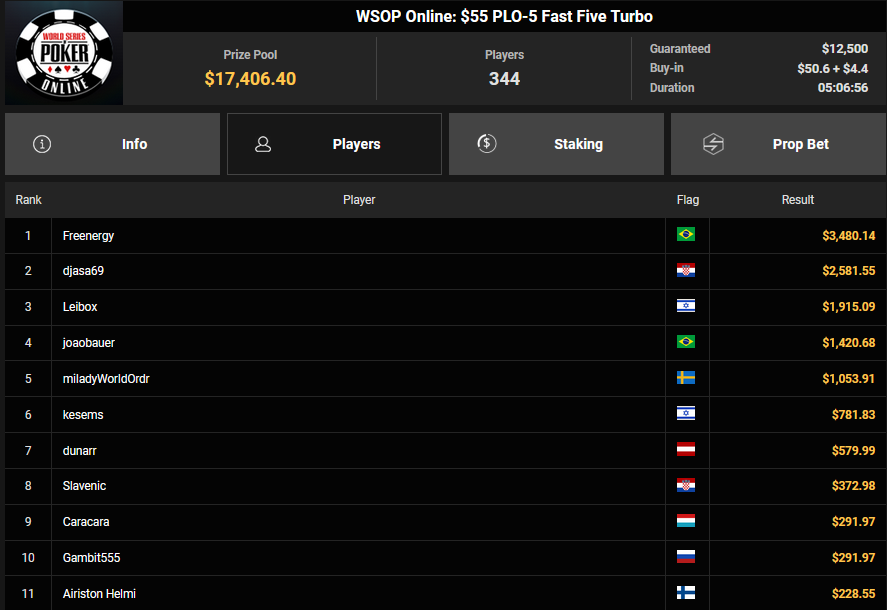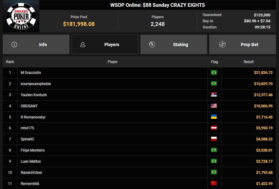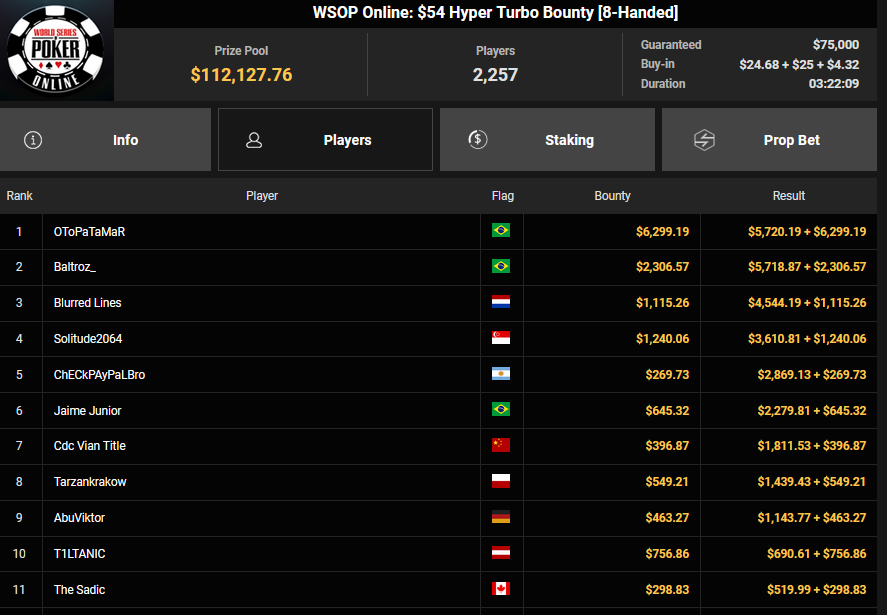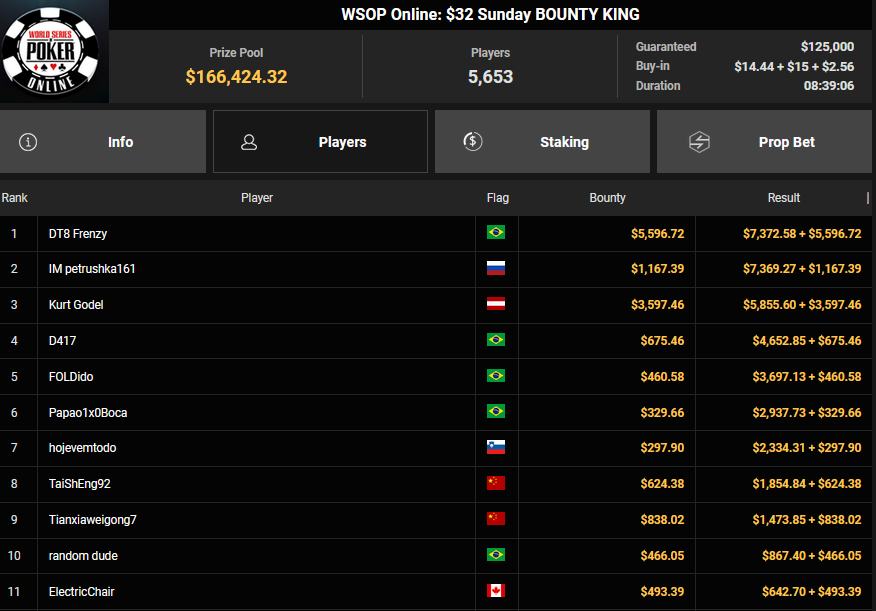 Beim $100 Flip & Go (#11) wurde die Millionengarantie deutlich überschritten, $1.403.055 landeten im Pot. IcePunishU schied als letzter Deutscher auf Rang 9 für $26.78 aus, BTO Justus1 kam auf Rang 6 für $52.434. OZRepublic kam als bester Österreicher auf Rang 4, was ihm satte $85.286 bescherte. Der Sieg ging auch hier nach Brasilien, andreyvolkan setzte sich durch und kassierte $176.931 + $30k WSOPP Super Pass.