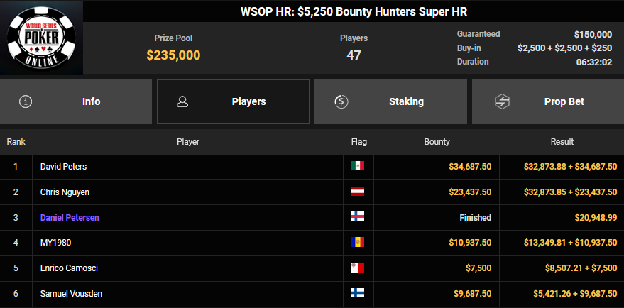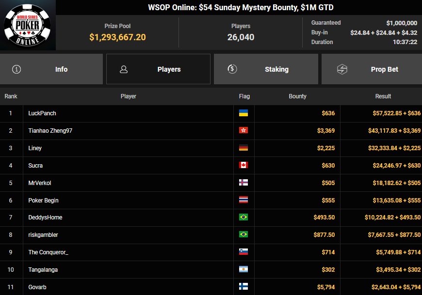 Alex Tkatschew kam beim $888 Sunday Crazy Eights HR auf Rang 2 und kassierte $10.491, Caspar Engelien belegte RAng 3 für $7.260. Liney wurde beim $54 Sunday MYstery Bounty Dritter für $32.333 + $2.225, Chris Nguyen verpasste den Sieg beim $5.250 Bounty Hunters Super HR, Platz 2 zahlte $32.873 + $23.437. La Pinta wurde Runner-up für $8.703 + $5.376 beim $215 Bounty Hunters.