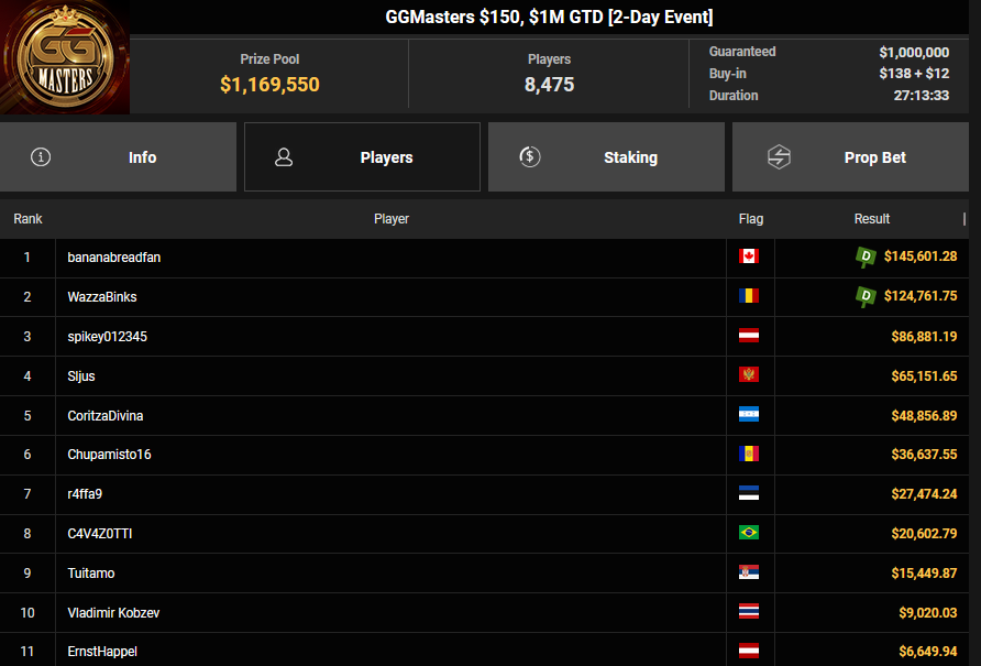 Bei den $150 GGMasters hatte es spikey012345 bei 8.475 Startern ins Finale geschafft, mit dem Sieg sollte es dann aber nicht klappen. Rang 3 bescherte ihm aber satte $86.881 als Preisgeld. Der Sieg ging nach einem Deal nach Kanada, bananabreadfan kassierte $145.601.