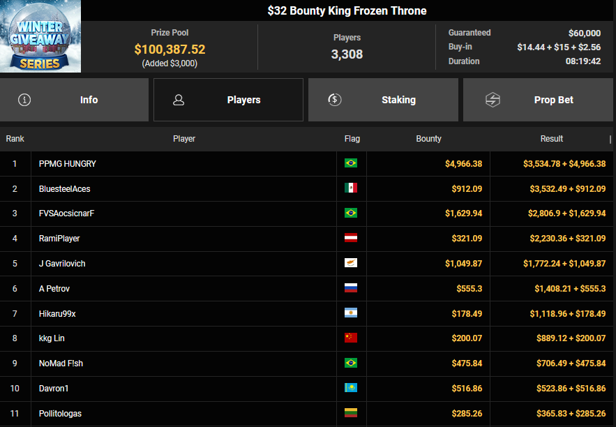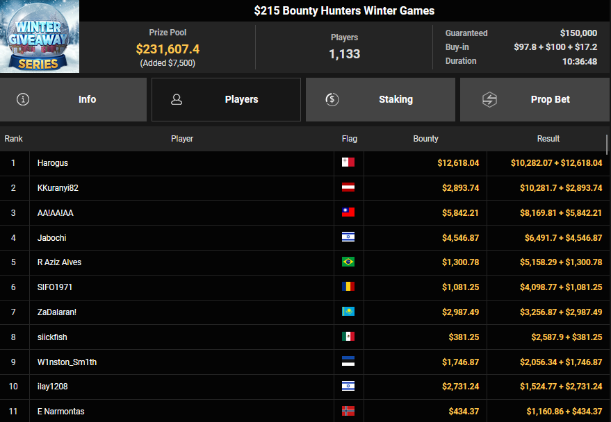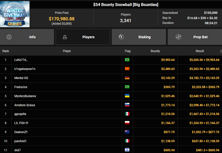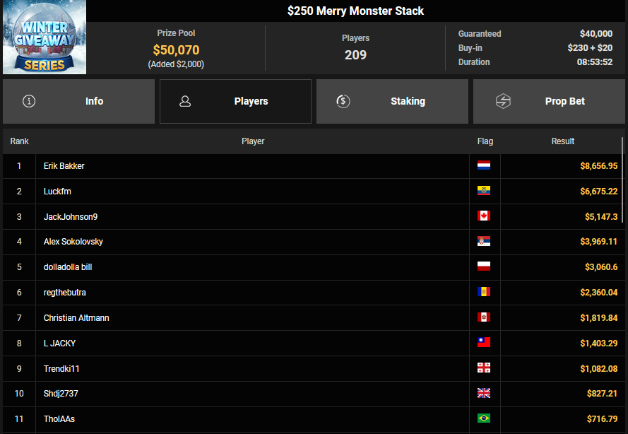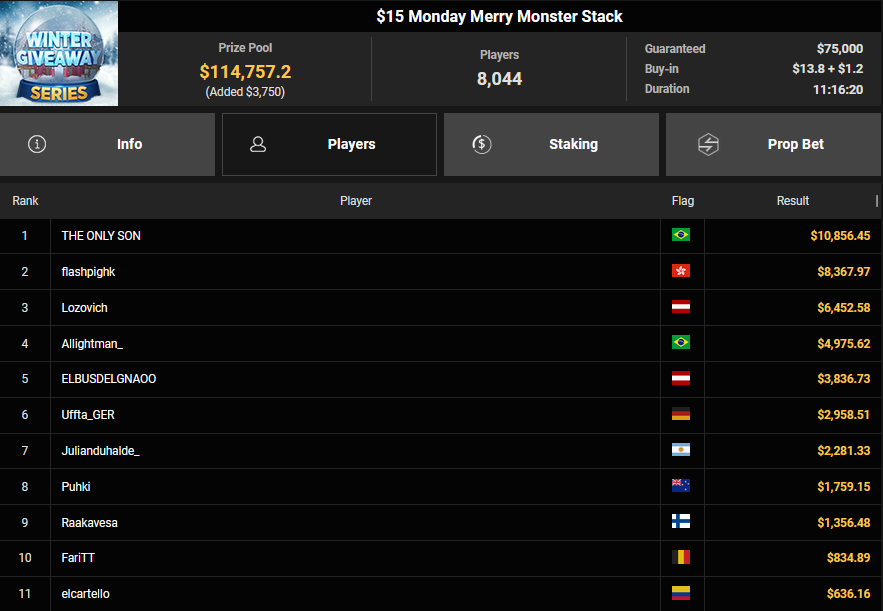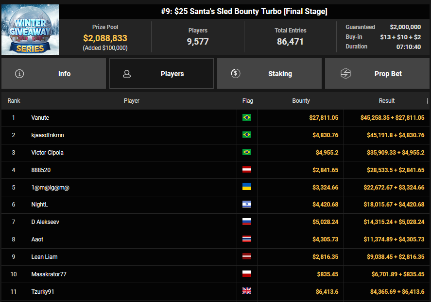 Beim $25 Santas Sled Bounty schaffte man mit 86.471 Entries die $2.000.000 Garantie nicht, $100.000 Added Price Money gab es dazu. Nach Abzug der Fee ware es $2.088.833 im Pot, 9.577 Spieler gingen ins Finale. Am Ende gab es einen brasilianischen Dreifachsieg, 888520 wurde als bester Österreicher Vierter für $28.533 + $2.841.