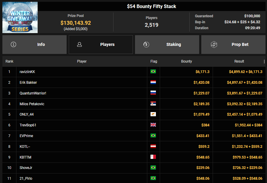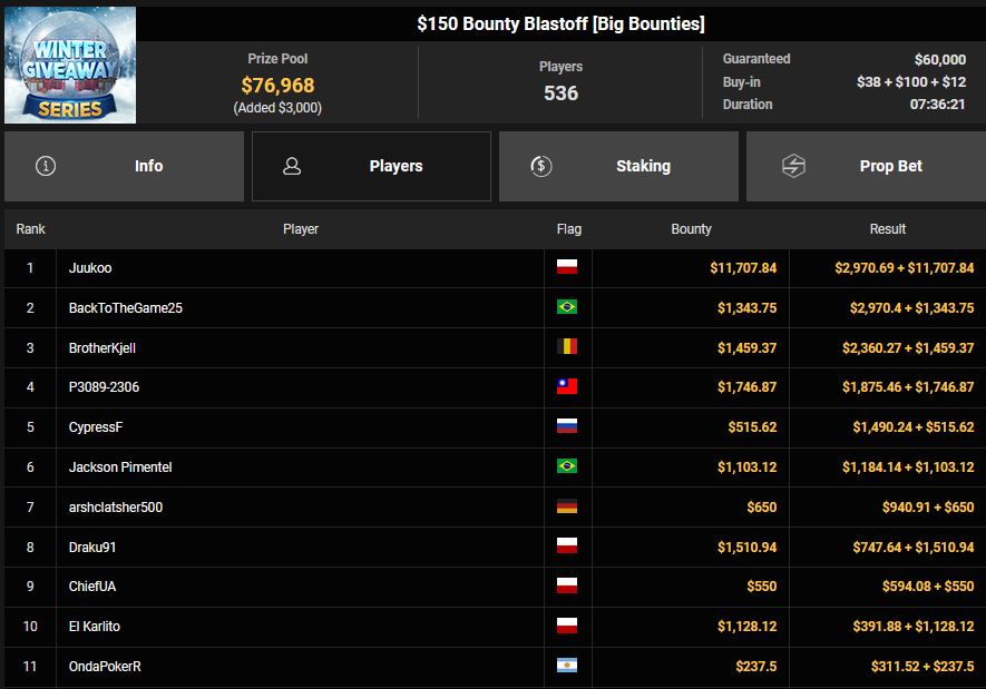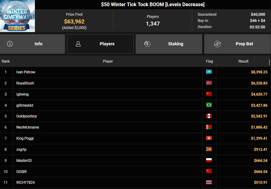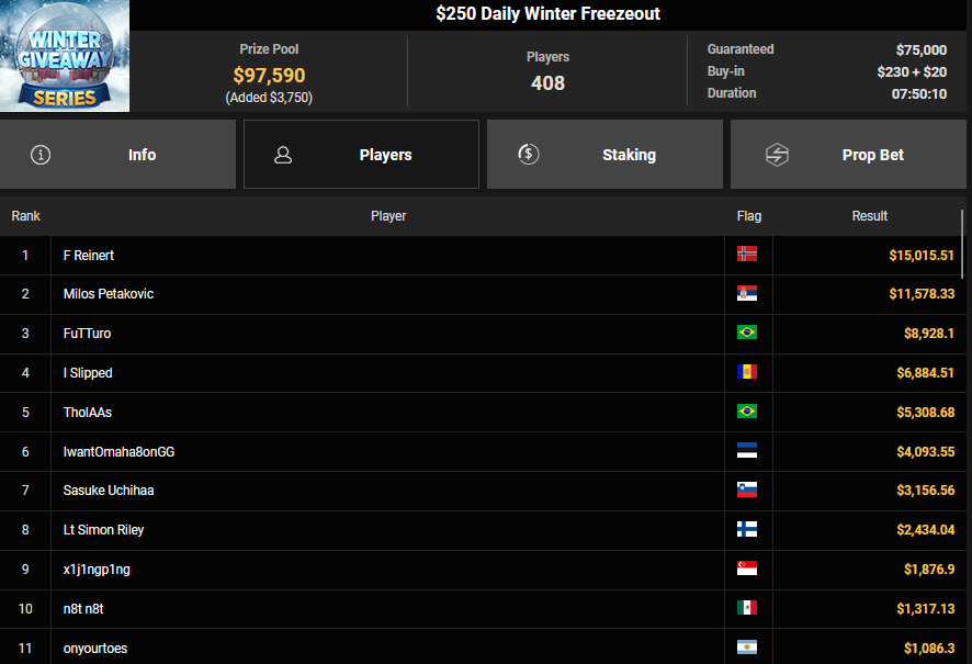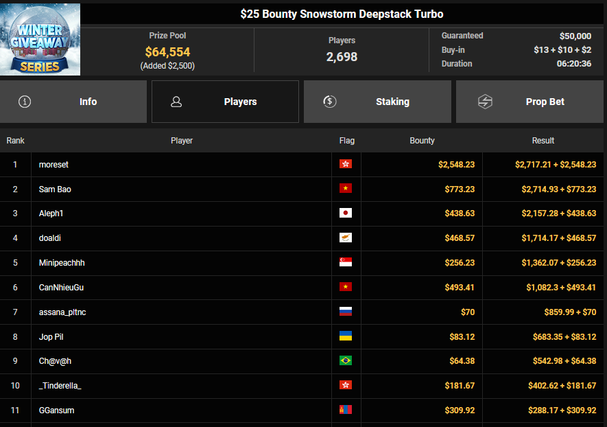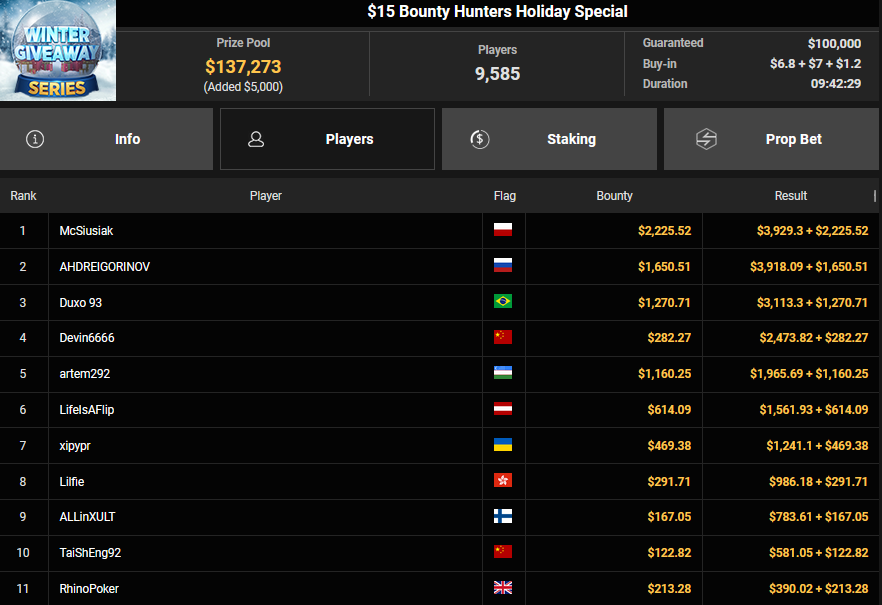 Beim $25 Santas Sled Bounty schaffte man mit 86.471 Entries die $2.000.000 Garantie nicht, $100.000 Added Price Money gab es dazu. Nach Abzug der Fee ware es $2.088.833 im Pot, 9.577 Spieler gingen ins Finale. Am Ende gab es einen brasilianischen Dreifachsieg, 888520 wurde als bester Österreicher Vierter für $28.533 + $2.841.