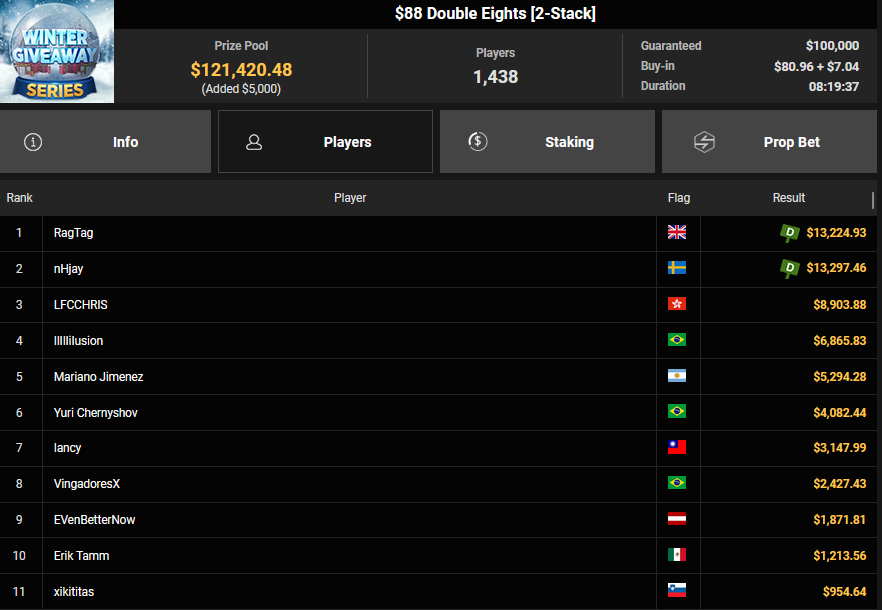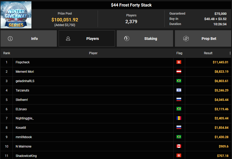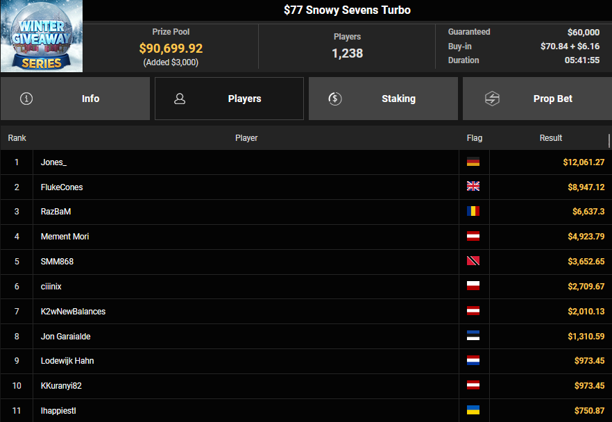 Jones_ holte den Sieg beim $77 Snowy Sevens Turbo für $12.061. Mement Mori kam hier auf Rang 4 für $4.923, später wurde er beim $44 Frost Forty Stack noch Runner-up für $8.823.