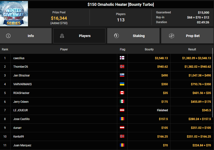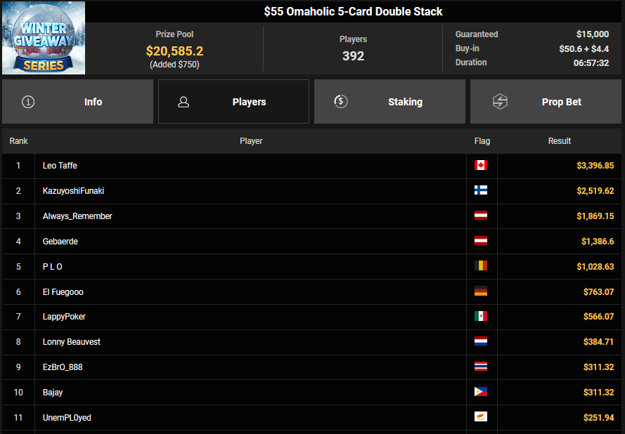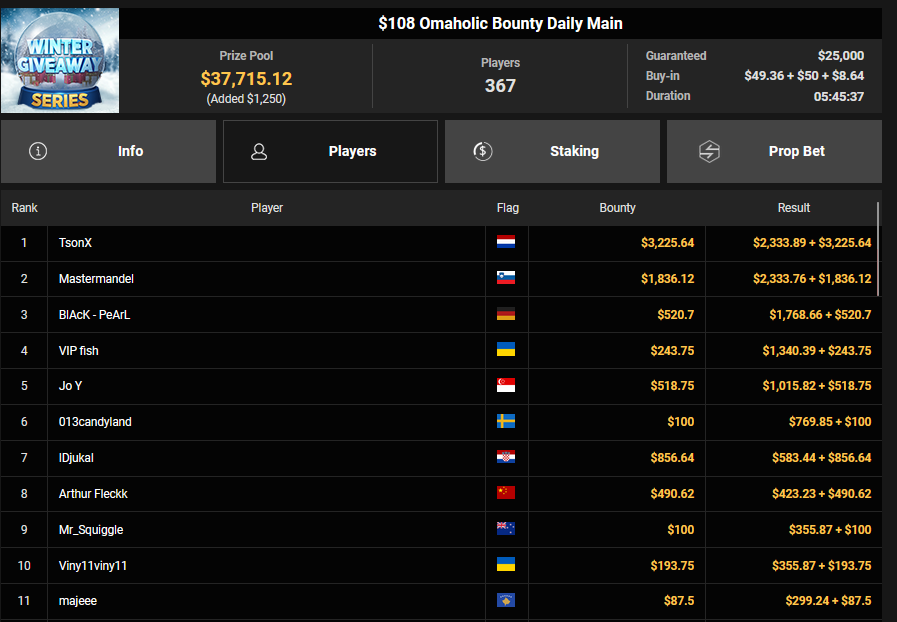 BlAcK – PeArL wurde Dritter beim $108 Omaholic Daily Main für $1.768 + $520, Lozovich belegte beim $15 Monday Merry Monster Stack ebenfalls Rang 3 für $6.452. KKuranyi82 wurde beim $215 Bounty Winter Games Runner-up für $10.281 + $2.893, Always_Remember konnte beim $55 Omaholic 5-Card Rang 3 für $1.869 mitnehmen, Gebaerde kam auf Rang 4 für $1.386.