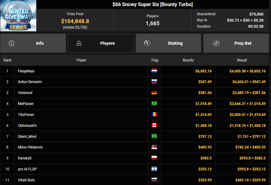 Violence! belegte beim $66 Snowy Super Six Rang 3 für $3.489 + $381, Mental GG wurde beim $54 Bounty Snowball ebenfalls Dritter für $4.182 + $3.143.