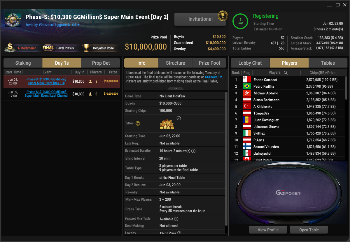 Noch fehlen $4.400.000 beim $10.300 GGMillion$ Super Main Event (Phase-S) auf die $10.000.000 Garantie, es gibt noch zwei Flights. Aktuell stehen 560 Entries zu Buche, gestern konnten 80 Entries verzeichnet werden, wobei von den DACHs nur Bluffcacher Tag 2 erreichte. Heute und morgen gibt es noch je einen Flight – und hier lohnt es sich auf jeden Fall auch, eines der Satellites zu versuchen.