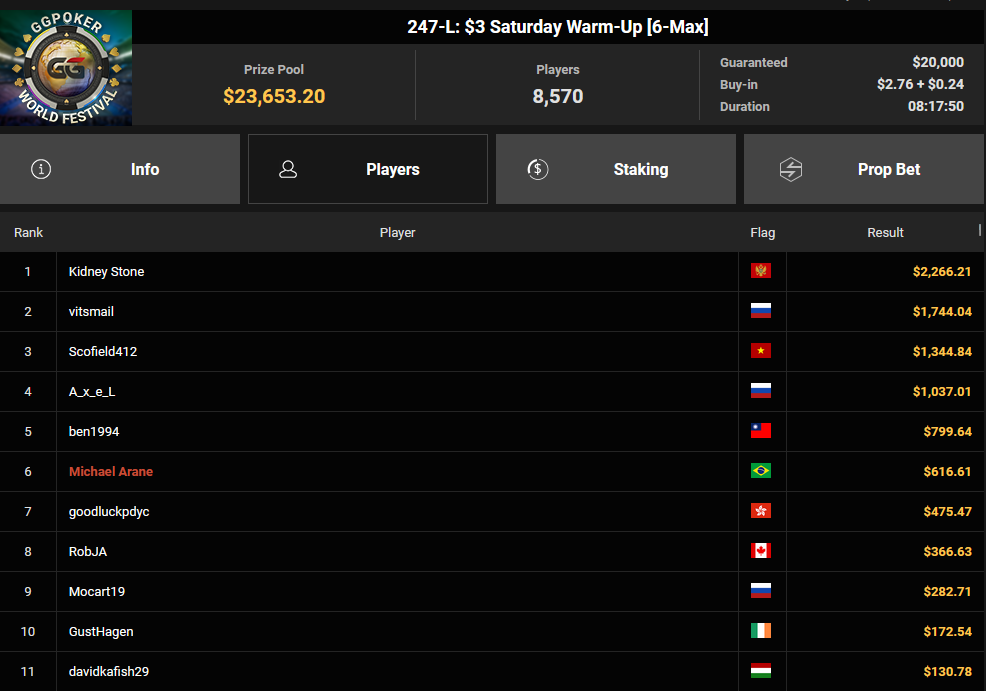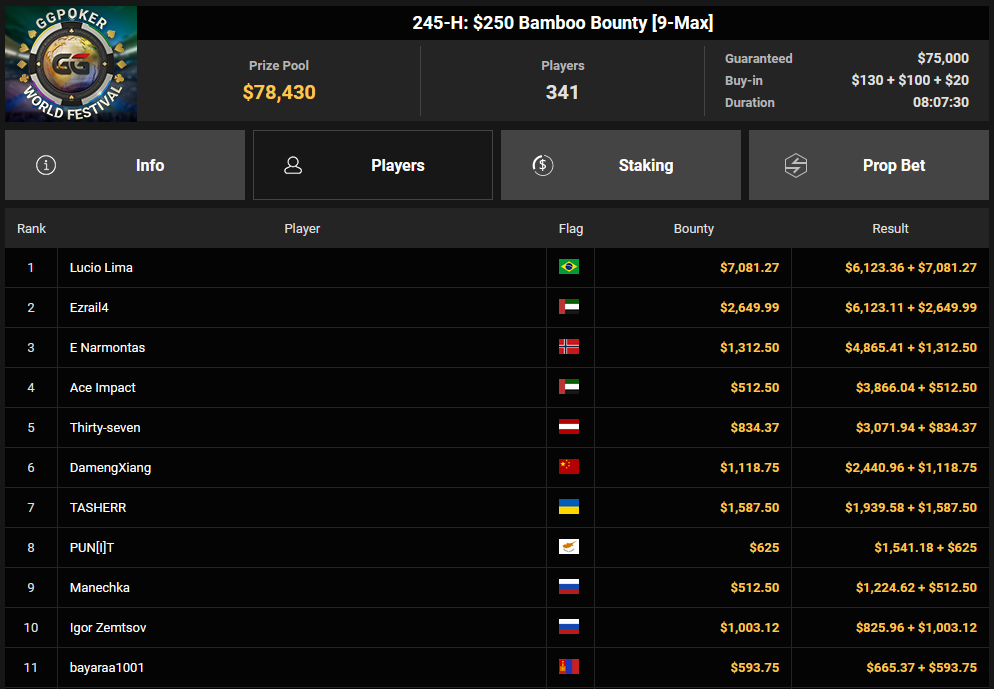 Bei den Side Events herrschte wieder gut Traffic, mit zahlreichen DACH-Erfolgen. ViviKivi startete mit einem zweiten Platz beim $3 Bamboo Bounty (245-L) und kassierte $1.284 + $215, Simon Beckmann holte Rang 3 beim $1.500 Bamboo Bounty ($4.721 + $1.750. J_7_Sucks konnte für Rang 5 beim $30 Saturday Warm-up (#247-M) $4.170 mitnehmen.