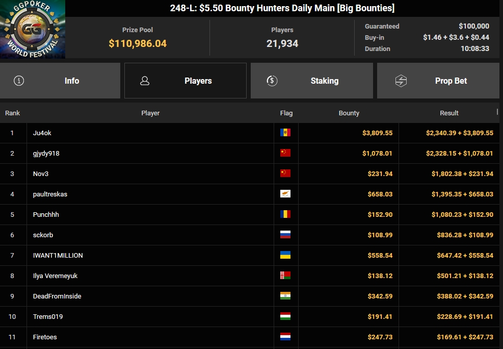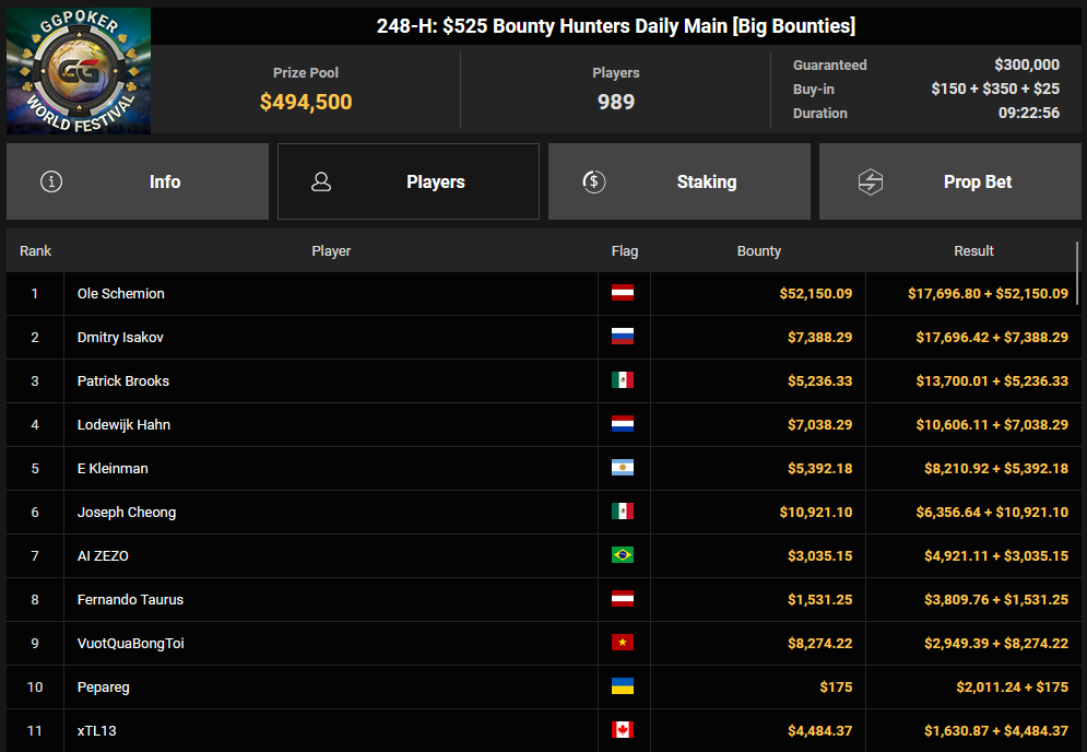 Ole Schemion schnappte sich den Sieg beim $525 Bounty Hunters Daily Main (#248-H) für $17.696 + $52.150, Fernando Taurus belegte Rang 8 für $3.809 + $1.531. Später schlug Ole Schemion dann auch beim $10.300 Saturday Secret KO zu und holte sich nicht nur die Siegprämie von $56.249, sondern auch gleich $125.000 an Bounties.