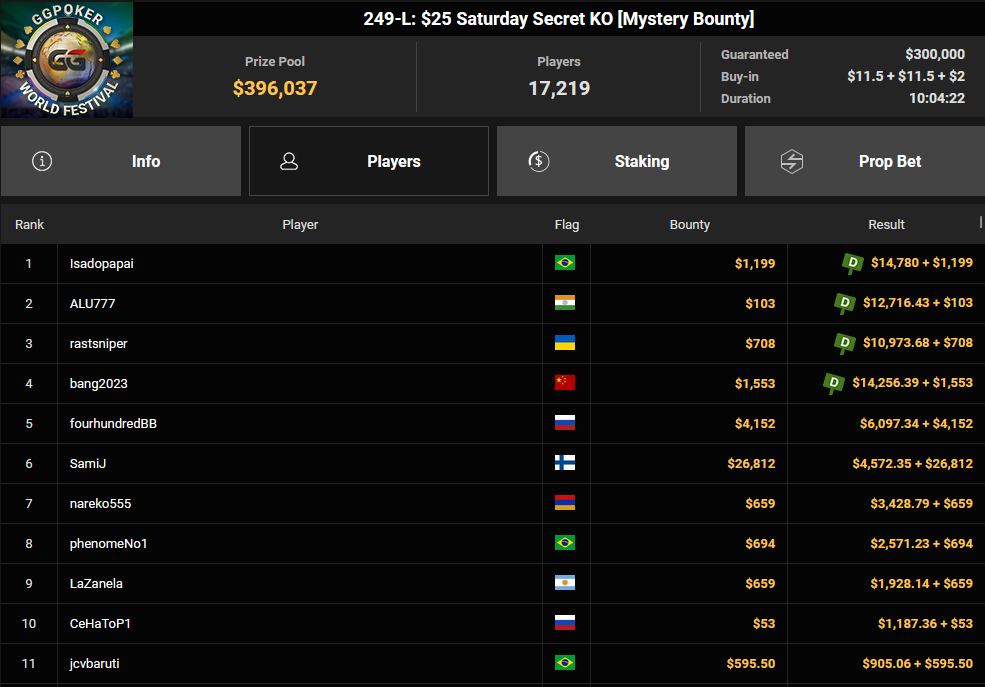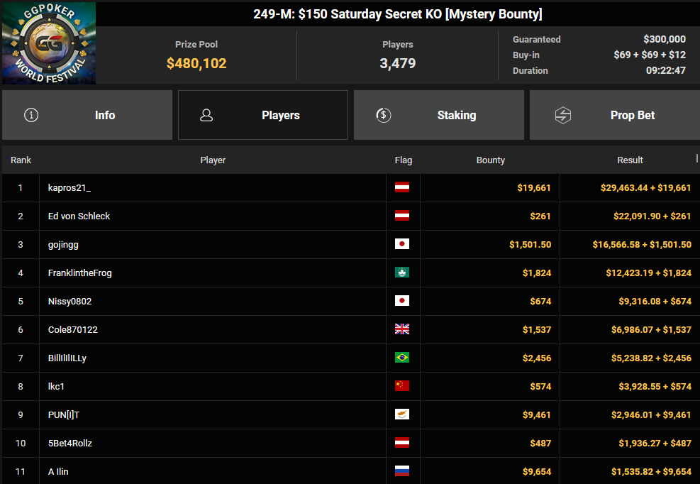 Sebastian Gähl ging beim $1.050 Saturday Secret KO (#249-H) als Sieger vom Tisch und kassierte $35.928 + $54.720. kapros21_ (1/$29.463 + $19.661) und Ed von Schleck (2/$22.091 + $261) feierten den Doppelsieg beim $150 Saturday Secret KO.