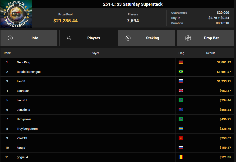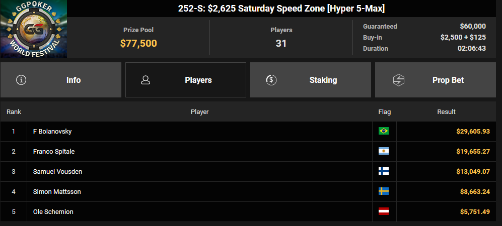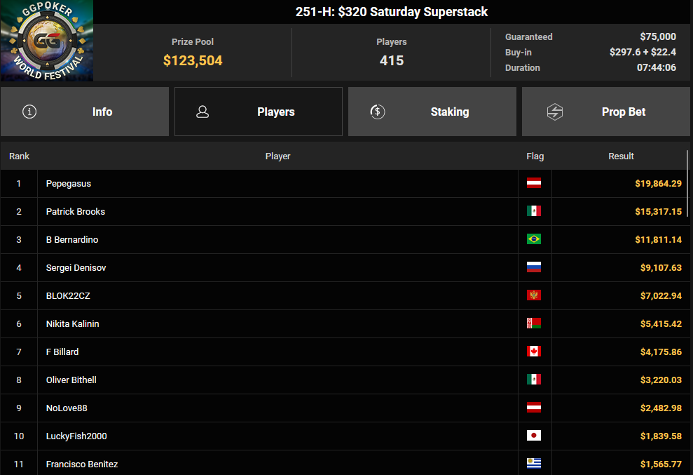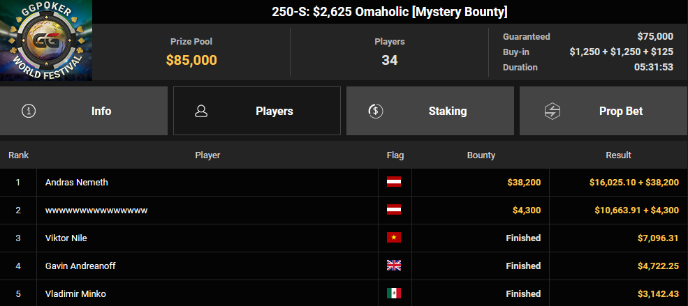TheQuads97 belegte beim $10 Omaholic Rang 3 für $1.449 + $227, wwwwwwwwwwwwwww wurde hinter Andras Nemeth Runner-up beim $2.625 Omaholic ($10.663 + $4.300). Pepegasus konnte sich den Sieg beim $320 Saturday Superstack für $19.864 sichern, NeboKing holte das $3 Saturday Superstack für $2.081. Auch die $30 Medium Ausgabe ging an Deutschland, FettBull siegte für $8.463.