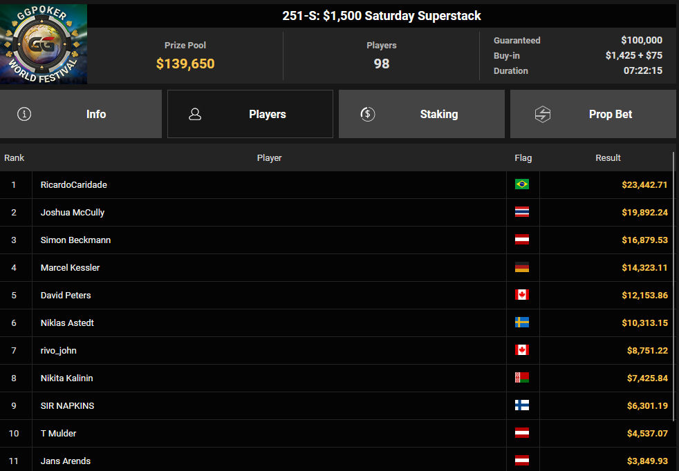Simon Beckmann holte beim $1.500 Saturday Superstack Rang 3 für $16.879, Marcel Kessler nahm für Rang 4 noch $14.323 mit.