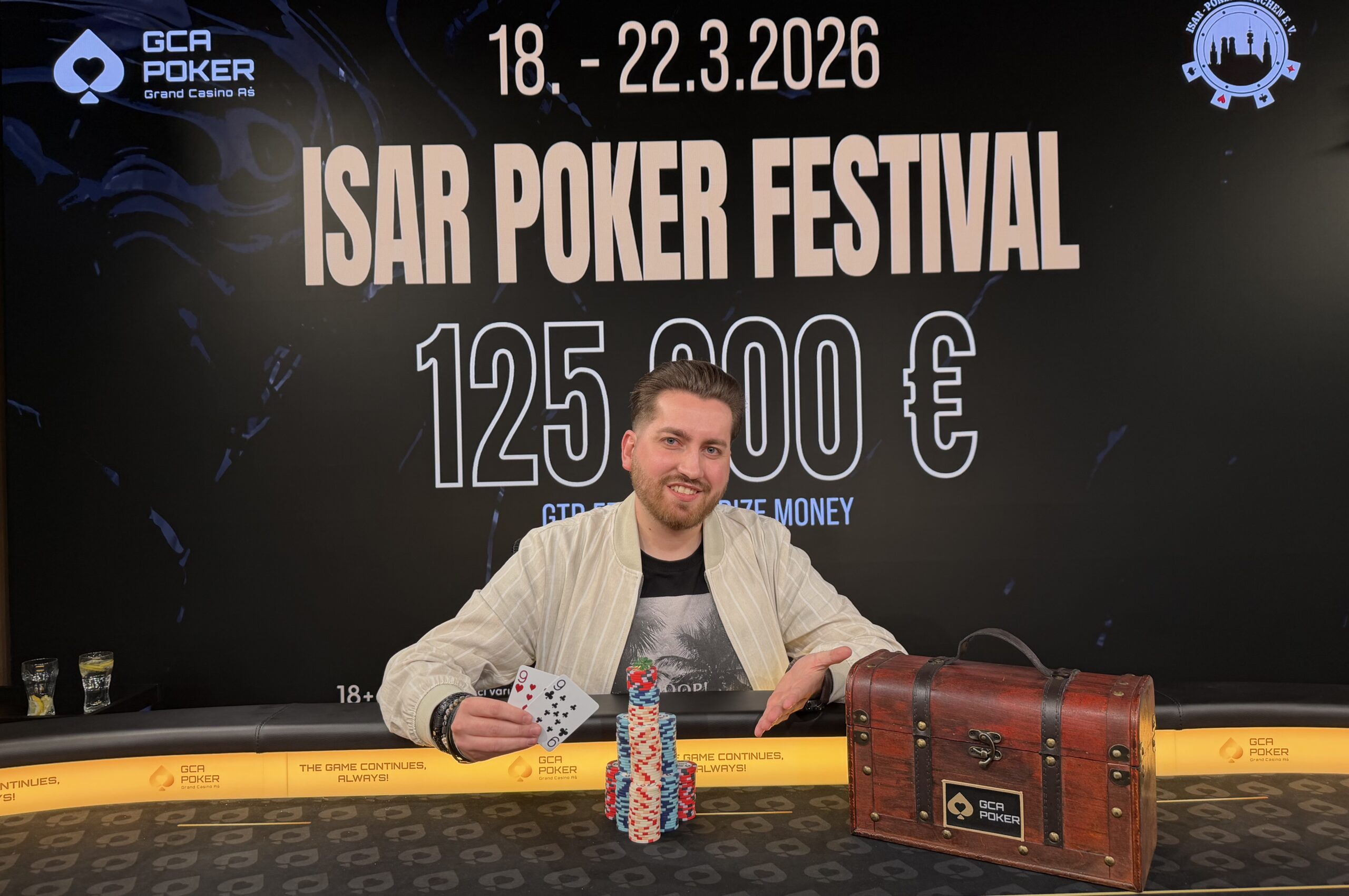 Seit Isar Poker am Mittwoch zum Isar Poker Festival kamen, herrscht Hochbetrieb im GCA. Gestern gab es drei Turniere, Highlight war das € 80 + 50 + 20 Isar Mystery Bounty, bei dem mit 20.000 Chips und 20 Minuten Levels um gleich € 30.000 gespielt werden konnte. 272 Spieler füllten den großen Pokerfloor, dazu kamen noch 87 Re-Entries und damit waren es gleich € 46.670 im Pot. Davon gingen € 17.950 an die Mystery Bounties, € 28.720 wurden auf die 54 Geldränge verteilt.