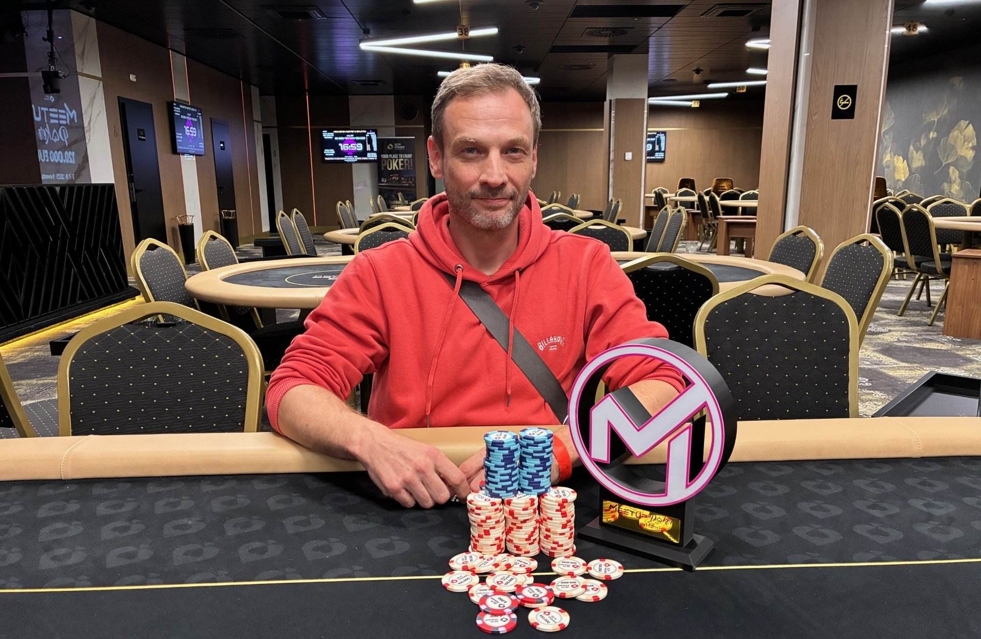 Gleich 213 Spieler stürmten an die Tische, dazu kamen noch weitere 74 Re-Entries. So wuchs der Preispool auf € 25.830 an, davon gingen € 14.350 an die Mystery Bounties und € 11.480 wurden auf die ersten 43 Plätze verteilt. Zu den Mystery Bounties gibt es leider keine Infos, die Preisgelder lagen zwischen € 65 und € 2.302. Erik Gross setzte sich nach einer langen Pokernacht durch und jubelte über die Trophäe.