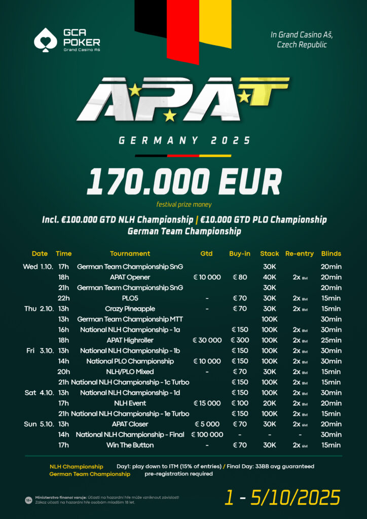 Im August fährt die Delegation des GCA wieder zur Amateur Weltmeisterschaft nach Nottingham, im Oktober ist das GCA Gastgeber der APAT Germany. Dieses Jahr gibt es auch den Team Bewerb, der zusätzlich für Action sorgt. Ehe es bei den Nationalen Championship Events so richtig losgeht, wird der die German Team Championship mit einem Buy-In von € 600/Team (4 Spieler) ausgetragen. Die € 130 + 20 National NLH Championship kommt dann mit € 100.000 GTD als Multi Flight Turnier, während die € 130 + 20 PLO Championship (€ 10.000 GTD) ein One Day Turnier ist. Sehen lassen kann sich auch das € 270 + 30 High Roller (€ 30.000 GTD).