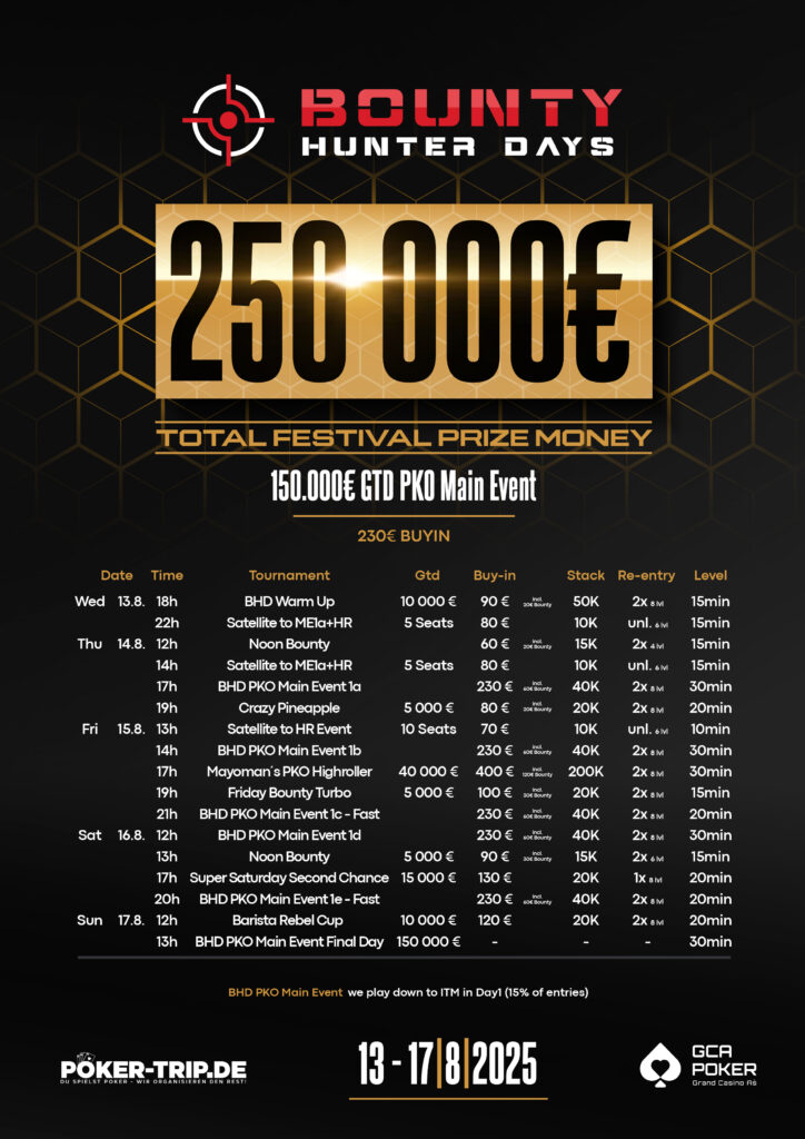 Bereits zum vierten Mal ist Stephan Kübler mit seinen Bounty Hunter Days dieses Jahr zu Gast im GCA. Satte € 250.000 Preisgeld warten, alleine € 150.000 davon entfallen auf das € 140 + 60 + 30 PKO Main Event. Wer Progressive Knockout mag, der darf sich dieses Festival nicht entgehen lassen. Natürlich hat Stephan auch wieder seine Freunde mit – Mayoman lädt zum € 240 + 120 + 40 PKO High Roller (€ 40.000 GTD) und Barista Rebel zum € 100 + 20 Barista Rebel Cup (€ 10.000 GTD). Die BHD haben mittlerweile eine große Community, viele Hotelzimmer sind schon gebucht und man kann sich einmal mehr auf ein Bountyfeuerwerk bei lauen Sommernächten freuen.