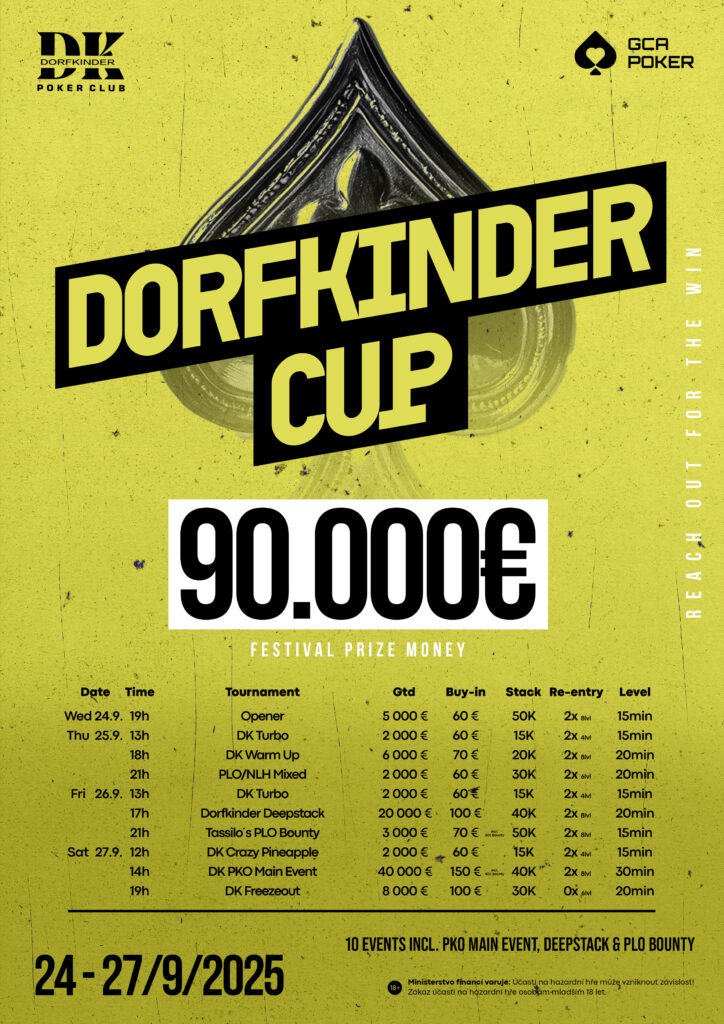 Erstmals bekommt auch der Dorfkinder Pokerclub ein Festival. Zehn Turniere, die kein Loch ins Budget reißen, aber für Stimmung und ansehnliche Preisgelder sorgen, warten auf die Spieler. Sowohl das € 90 + 10 Deepstack (€20.000 GTD), als auch das € 90 + 40 + 20 PKO Main Event (€ 40.000 GTD) sind die Highlights.