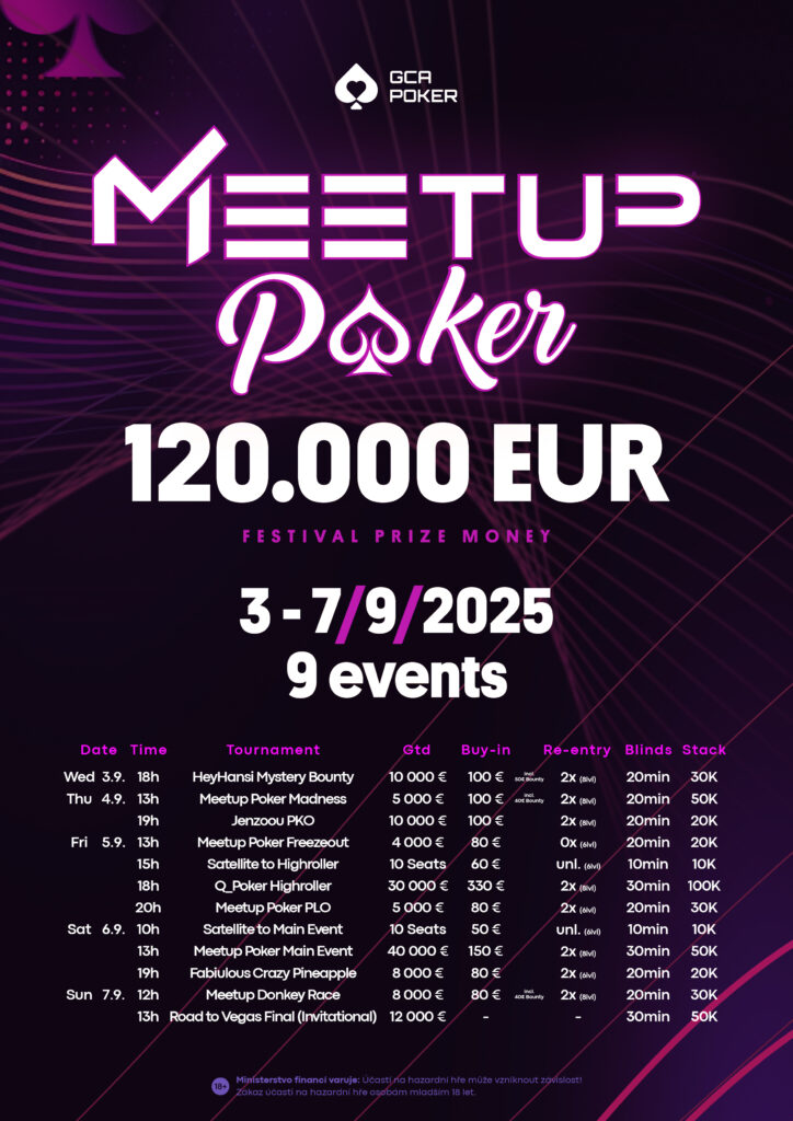 Meetup Poker steht ebenfalls für ein Community-Treffen, das sich schnell etabliert hat. Dieses Mal sind die Twitch-Streamer HeyHansi, Jenzoou und Q_Poker am Start, auch Globetrotter Fabian „Fabiulous“ Bartuschk darf nicht fehlen. Jeder hat sein Turnier, dazu kommen noch weitere Side Events und natürlich das € 130 + 20 Meetup Poker Main Event (€ 40.000 GTD).