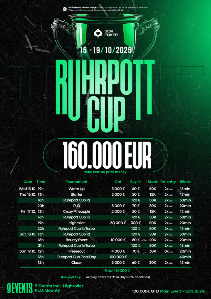 Auch Ruhrpott Poker haben eine große Community und regelmäßig geht es gemeinsam zum Festival ins GCA. Das € 100 + 20 Main Event ist ein Multi Flight Turnier mit einer € 100.000 Garantie. Dazu kommen noch einige Side Events, die für reichlich Action und Stimmung sorgen.
