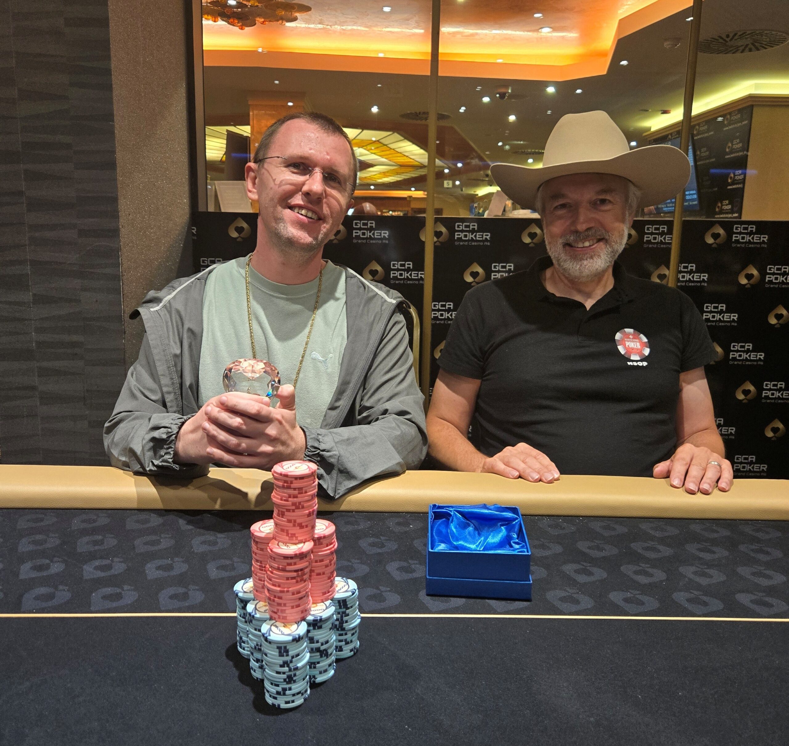 Starke Zahlen lieferte auch das € 70 + 10 Kings & Queens. Hier spielte man mit 30.000 Chips und 20 Minuten Levels um mindestens € 10.000, doch bei 148 Startern und weiteren 46 Re-Entries landeten hier auch gleich € 13.580 im Pot. Die ersten 29 Plätze waren bezahlt, € 102 gab es als Min-Cash. Auf den Sieger warteten € 2.932, doch im Heads-up kam es hier zu einem Deal. Johnny Hell teilte brüderlich mit Dieter Good, der mit Bruno Wyss und der HSOP-Truppe aus der Schweiz angereist war, und kassierte € 2.610, Dieter nahm € 2.609 mit.