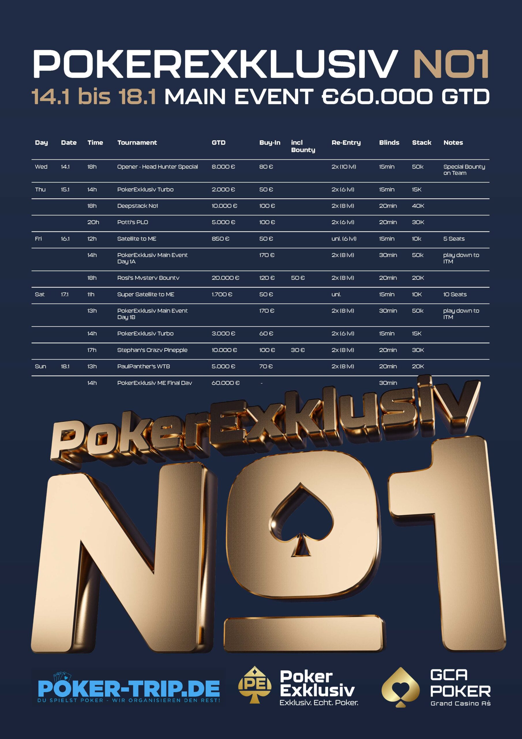 Aber, natürlich ist auch hier ein Turnier alleine noch keine Party und deshalb gibt es einige Turniere mehr. Gestartet wird mit dem € 80 Opener (€ 8.000 GTD/50k/15′), wobei es hier ein Special Bounty auf das Pokerexklusiv Team geben wird.
