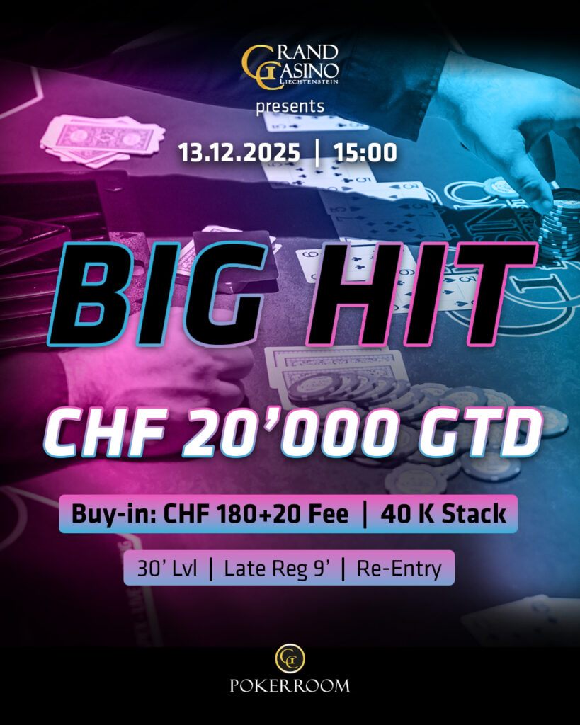 In ganz geordneten Verhältnissen und ohne Bounties geht es heute ins gewohnte CHF 90 + 10 Weekstarter (CHF 3.000 GTD/30k/20′), bei den Cash Games geht es wie immer ab den Blinds CHF 1/3 NLH bzw. CHF 2/2 PLO mit einem Rake CAP von CHF 5 und dem Bad Beat Jackpot an die Tische. Alles zum Pokerangebot des Grand Casino Liechtenstein gibt es auf der Webseite gcli.li, auf der Poker Facebook Seite des GCLI bliebt Ihr immer auf dem Laufenden.