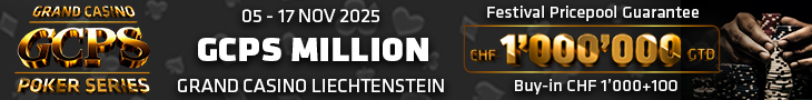 Die nächsten zwei Tickets gibt es schon am Sonntag bei einer neuen Ausgabe der CHF 115 + 15 Grand Stack GCPS Edition (CHF 10.000 GTD inkl 2 x CHF 1.100 Tickets). Das nächste Satellite gibt es am kommenden Mittwoch zu den bekannten Konditionen. Dieses Wochenende steht aber im Zeichen des CHF 150 + 150 + 30 Mystery Bounty. Hier spielt man mit 50.000 Chips und 30 Minuten Levels um mindestens CHF 100.000. Es gibt insgesamt vier Flights (1 x Fast 20′), am Sonntag, den 26. Oktober, geht es ins Finale. Bei den Cash Games wird wie immer ab CHF 1/3 NLH bzw. CHF 2/2 PLO mit einem Rake CAP von CHF 5 und Bad Beat Jackpot gespielt. Alles zum Pokerangebot des Grand Casino Liechtenstein gibt es auf der Webseite gcli.li, auf der Poker Facebook Seite des GCLI bliebt Ihr immer auf dem Laufenden.