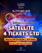 Nach der Action beim Mystery Bounty läuft nun im Grand Casino Liechtenstein der Countdown zum letzten Festival des Jahres. Schon jetzt haben sich viele zu den Bounty Hunter Days angekündigt und auch die Nachfrage bei den Satellites ist gut. Gestern, den 10. Dezember, gab es das dritte CHF 50 + 10 Satellite, gespielt wurde wieder mit 20.000 Chips und 20 Minuten Levels. Vier CHF 290 Tickets waren garantiert, mit 16 Teilnehmern und noch zehn Re-Entries schaffte man auch locker die Garantie und CHF 140 wurden noch auf der Bubble ausgezahlt.